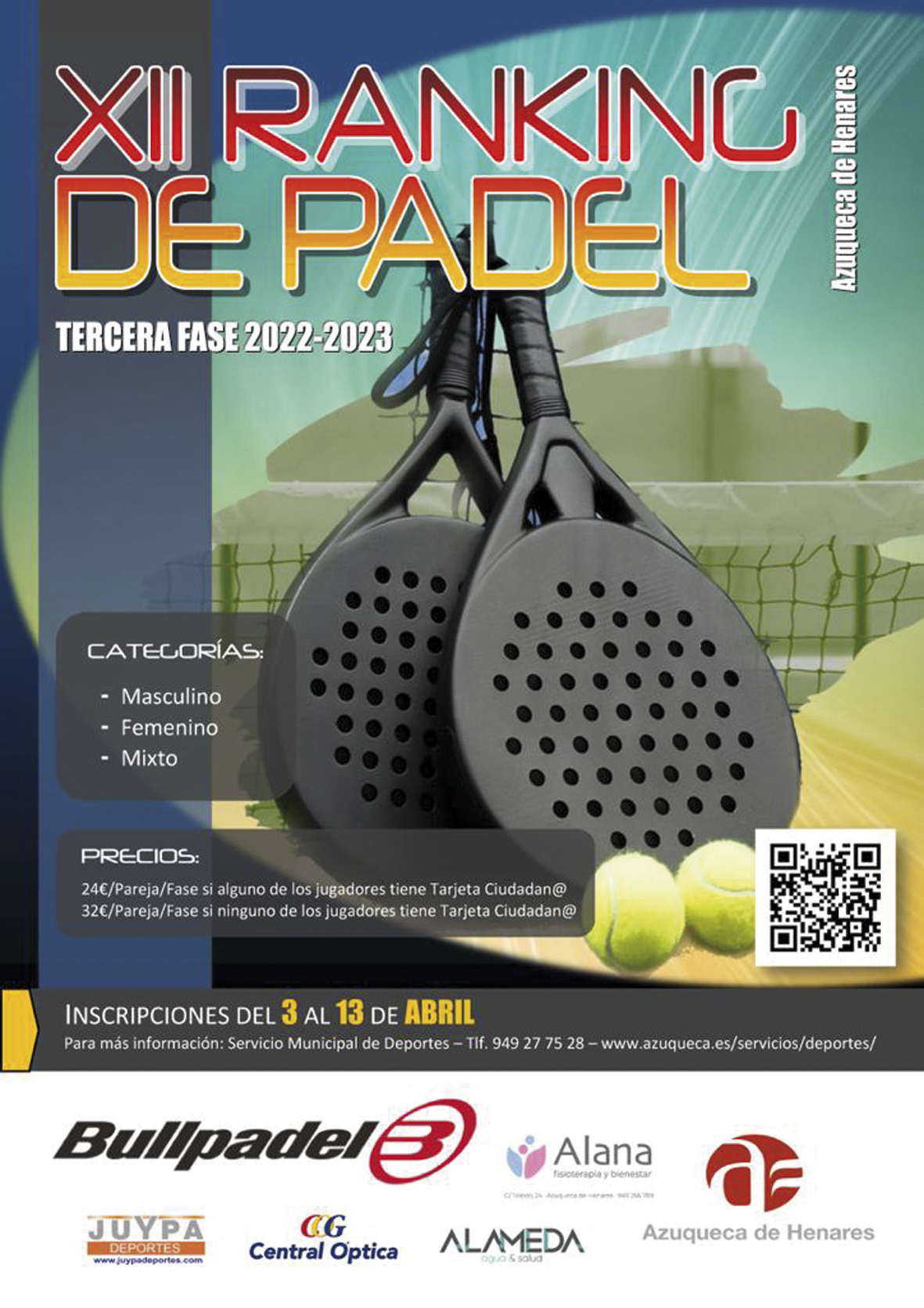 Hasta el próximo día 13 de abril, está abierta la inscripción en la tercera fase el XII Ranking de Pádel organizado por el Ayuntamiento de Azuqueca de Henares. Como en las dos fases anteriores, la competición incluye las categorías masculina, femenina y mixta. El precio de inscripción para las categorías masculina y femenina por pareja es de 24 euros si alguno de los jugadores es titular de la Tarjeta Ciudadana y de 32 euros sin este documento municipal. Para la categoría mixta, los precios son de 14 y 18 euros, respectivamente.