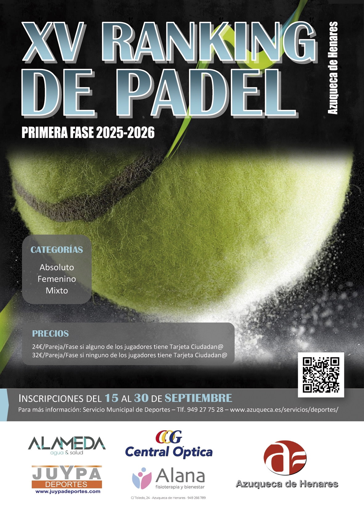 Desde este lunes, 15 de septiembre, y hasta el próximo día 30, el Ayuntamiento de Azuqueca de Henares mantiene abierto el plazo de inscripción en la primera fase de la edición número 15 del Ranking de Pádel, que cuenta con tres categorías de competición: Masculina, Femenina y Mixta.