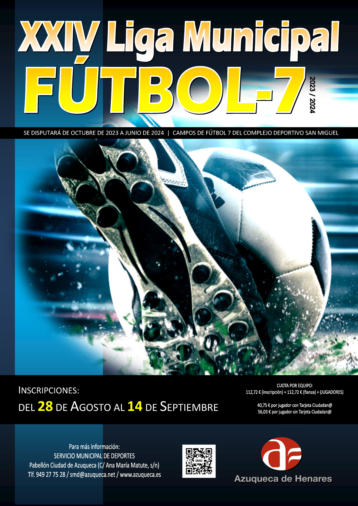 Hasta el 14 de septiembre, está abierto el plazo de inscripción en la Liga Municipal de Fútbol 7, que esta temporada alcanza su edición número 24. “Es una de las competiciones que ponemos en marcha desde el Ayuntamiento de Azuqueca de Henares para facilitar y promocionar el deporte, entendido como una actividad física saludable y un elemento fundamental para fomentar valores y favorecer la integración y la igualdad”, destaca el alcalde, José Luis Blanco, quien recuerda que Azuqueca fue reconocida el año pasado con el Premio Nacional del Deporte.