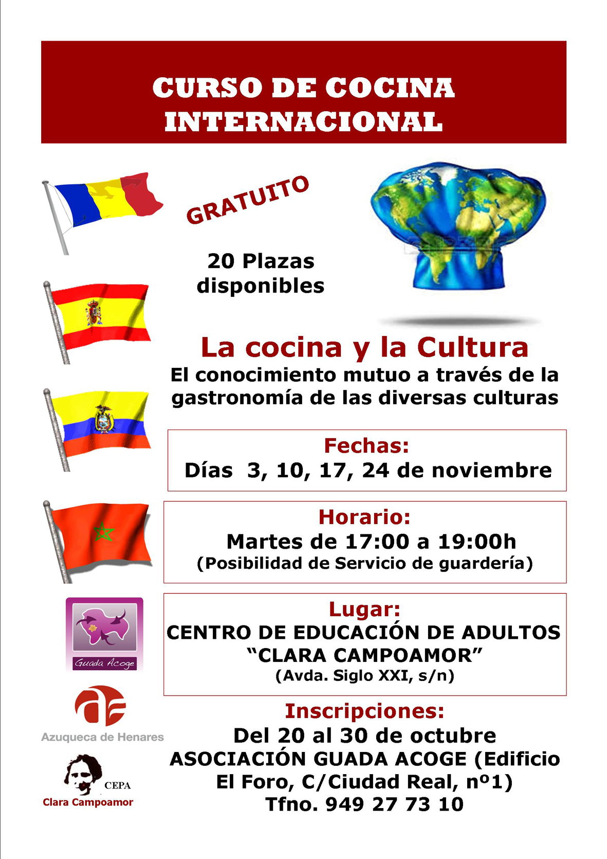 Hasta el 30 de octubre, se admiten inscripciones en el curso de cocina internacional que organizan el Ayuntamiento de Azuqueca de Henares y la asociación Guada Acoge. "Esta actividad, que en ediciones pasadas contó con muy buena acogida, pretende favorecer el conocimiento de distintas culturas a través de la gastronomía", explica la concejala de Cohesión Social, Charo Martín. La participación es gratuita y hay 20 plazas disponibles. Las personas interesadas pueden formalizar su participación en la sede de Guada Acoge en Azuqueca, ubicada en el edificio de El Foro, y en el teléfono 949 27 73 10. Rumanía, España, Ecuador y Marruecos son los países representados en esta nueva convocatoria, que se desarrollará los martes día 3, 10, 17 y 24 de noviembre por las tardes, de 17 a 19 horas. "Las clases cuentan con la presencia de vecinos de Azuqueca que proceden de esos países y que, de manera desinteresada, van a enseñar a elaborar un plato principal y un postre típicos, al tiempo que comparten algunas de sus costumbres y tradiciones", avanza la edil, quien agradece la colaboración de estos vecinos, así como del Centro de Adultos Clara Campoamor, que cede sus instalaciones para albergar este curso.Charo Martín recuerda que esta iniciativa forma parte del proyecto 'Atención a la convivencia y gestión de la diversidad cultural' que desarrolla en Azuqueca la asociación Guada Acoge en el marco de la Estrategia Municipal contra la Pobreza y la Exclusión Social.