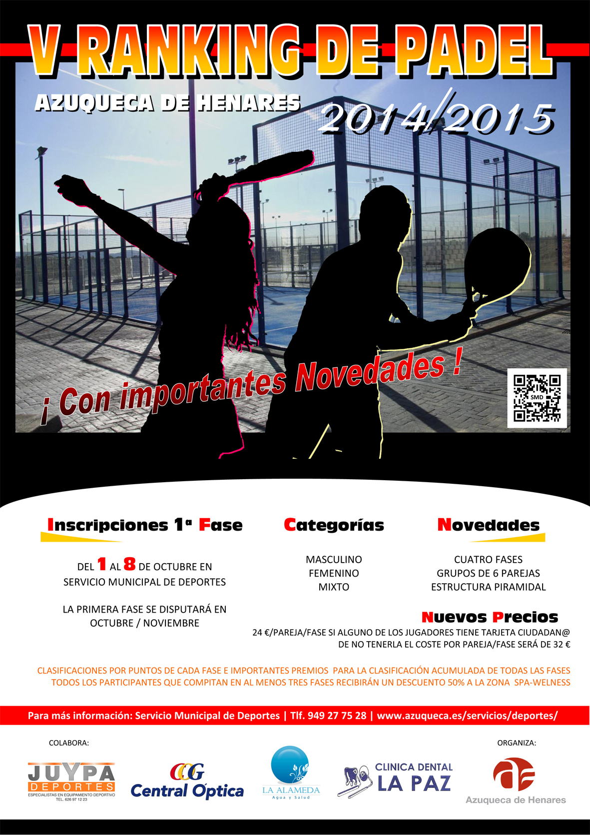 Desde este miércoles, día 1, y hasta el 8 de octubre, permanece abierto el plazo de inscripción en la primera fase del Ranking de Pádel, que organiza por quinto año el Ayuntamiento de Azuqueca de Henares. En esta edición, la competición mantiene las tres categorías ya existentes, en concreto, Masculino, Femenino y Mixto, e incluye varias novedades. "Pasamos de tres a cuatro fases, con una duración de dos meses, y se reduce a seis el número de parejas por grupo", explica el concejal de Deportes, José Luis Escudero, quien añade que "también se ha optado por una estructura de juego piramidal, en lugar de lineal, para facilitar los ascensos y lograr un mejor equilibrio en el nivel de los integrantes de cada grupo".Las personas interesadas deben dirigirse a la oficina del Servicio Municipal de Deporte (SMD), ubicada en la primera planta del pabellón Ciudad de Azuqueca, en el siguiente horario: lunes a viernes, de 10 a 13:30 h., y, además, los lunes y jueves, de 17 a 19:30 h. (teléfono: 949 27 75 28 y correos electrónicos: