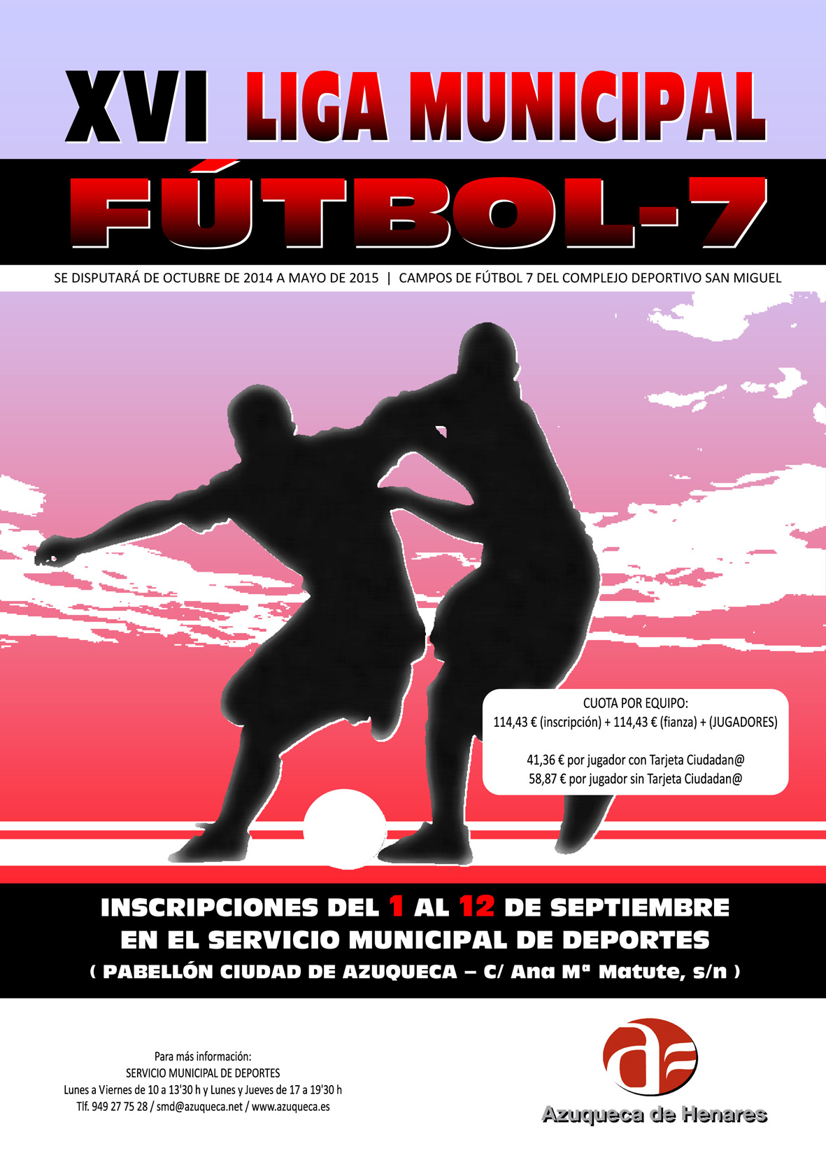 Hasta el día 12 de septiembre, está abierto el plazo de inscripción en la XVI Liga Municipal de Fútbol 7 de Azuqueca de Henares, que se disputará entre los meses de octubre de 2014 y mayo de 2015 en los campos del complejo deportivo San Miguel. Los interesados deben dirigirse al Servicio Municipal de Deportes (teléfono 949 27 75 28, correo electrónico AQUÍ.