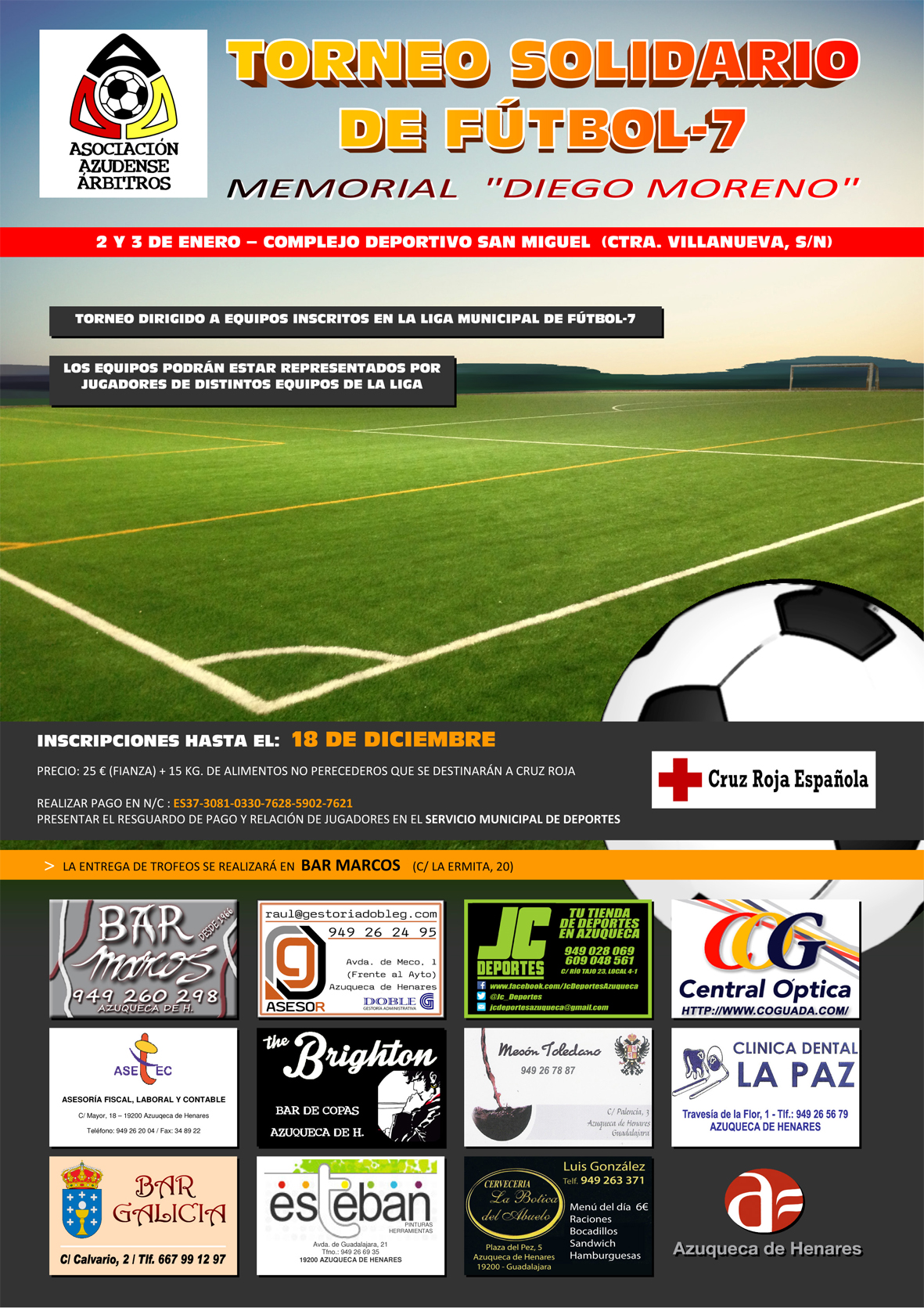 Con motivo de la Navidad, Azuqueca de Henares acoge distintas actividades que combinan deporte y solidaridad. Además de la XXIX San Silvestre Alcarreña, que se corre el 31 de diciembre y en la que se recogen alimentos no perecederos para Cáritas (más información, pinchando aquí), la Asociación Azudense de Árbitros y el Ayuntamiento organizan el Torneo de Fútbol 7 Memorial 'Diego Moreno', que se disputa los días 2 y 3 de enero en el complejo San Miguel. La competición se dirige a jugadores y equipos inscritos en la Liga Municipal de Fútbol 7 y el precio es de 25 euros, en concepto de fianza, y de 15 kilos de alimentos no perecederos para Cruz Roja Española. La inscripción se cierra este viernes, 18 de diciembre, y las personas interesadas deben dirigirse al Servicio Municipal de Deportes (SMD), ubicado en la planta baja de El Foro.Por otra parte, el 3 de enero, el Club Triatlón Azuqueca, con apoyo del Ayuntamiento, impulsa una jornada de natación solidaria, desde las 10:30 horas, en la piscina climatizada municipal. Se han programados dos pruebas por equipos: 100x100 (10 nadadores en series de relevos de 100 metros hasta completar 10.000 metros) y 50x50 (5 nadadores en series de relevos de 50 metros para un total de 2.500 metros). La cuota es de 100 euros para los equipos de 100x100, mientras que los de 50x50 deben abonar 35 euros. Parte de la recaudación se donará a la Asociación Vasija. Más información e inscripciones, en el correo