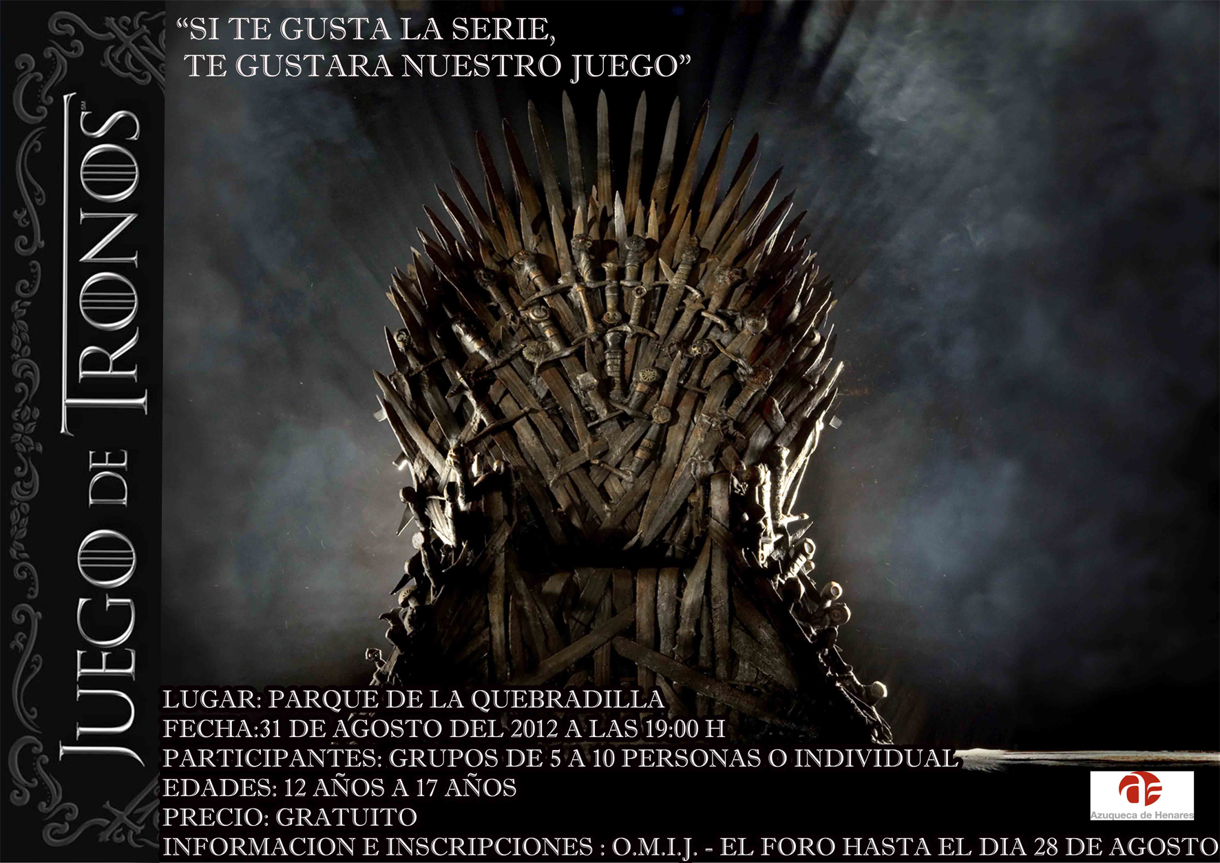 La Oficina Municipal de Información Juvenil (OMIJ) ha abierto el plazo de inscripción en una actividad inspirada en ‘Juego de tronos’, una novela de fantasía ambientada en la Edad media escrita por George R. R. Martin y llevada a la televisión. “La serie cuenta con un gran número de seguidores y, para hacer esta propuesta de ocio más atractiva, nos hemos inspirado en ella”, explica la concejala de Juventud, Sagrario Bravo. En concreto, los participantes se agruparán según las cuatro casas de la novela –Stark, Baratheon, Lannister y Targaryen- y sus respectivos lemas para ir superando pruebas que les haga merecedores del Trono de Hierro.La actividad se celebrará el martes 31 de agosto en el parque de La Quebradilla a partir de las 19 horas. “La inscripción es gratuita y está abierta a jóvenes con edades comprendidas entre los 12 y los 17 años, que pueden participar de manera individual o formando un grupo entre los 5 y los 10 integrantes”, detalla la edil azudense. Los interesados tienen de plazo hasta el día 28 para apuntarse en la OMIJ, que, durante el mes de agosto, permanece abierta de lunes a viernes de 10 a 14 horas y los miércoles, además, de 17 a 19:30 horas.Otras actividadesEn agosto, los jóvenes azudenses también pueden divertirse en la Sala de Juegos de El Foro, que dispone de futbolín, ping pong, juegos de mesa y billar. Además, previa reserva, se puede hacer uso de la Sala de Audiovisuales, abierta a grupos de al menos cinco personas que deseen jugar a la consola en pantalla grande.