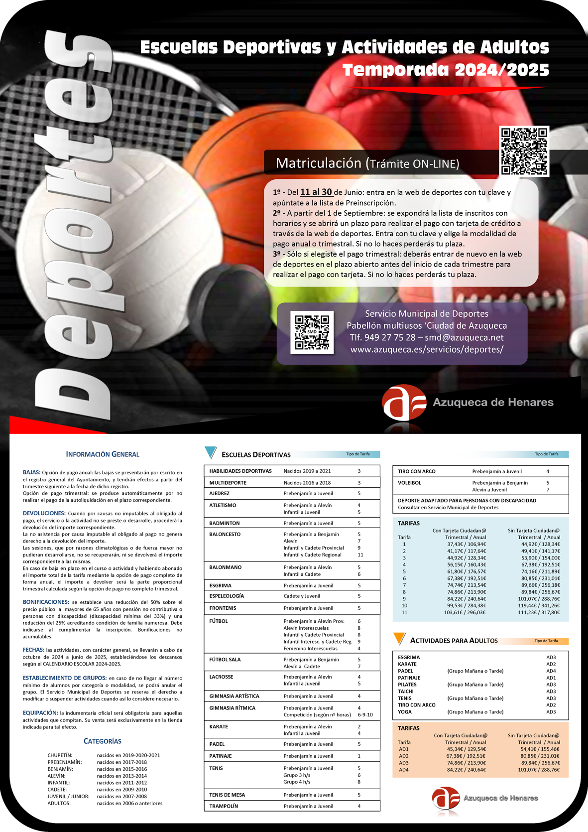 Desde este martes día 11 y hasta el 30 de junio, el Ayuntamiento de Azuqueca de Henares mantiene abierto el plazo de preinscripción en la temporada deportiva 2024/2025, tanto para las Escuelas Deportivas Municipales dirigidas a menores de edad (a partir del año 2016), como para las actividades de adultos. “Desde este Ayuntamiento, apostamos por el Deporte como hábito saludable y herramienta para trabajar valores como la igualdad, el compañerismo o el esfuerzo”, destaca el alcalde, Miguel Óscar Aparicio.
