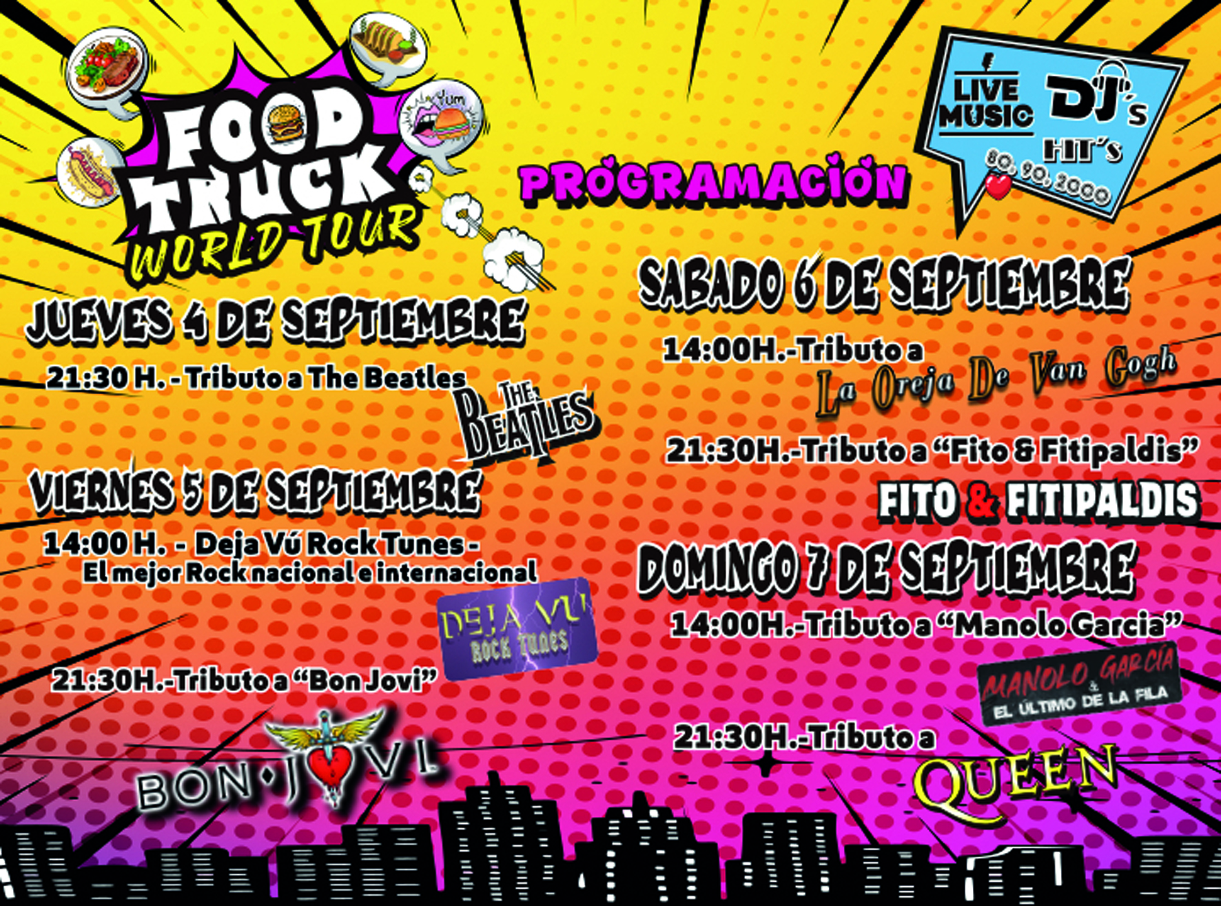 El “Food Truck World Tour” se podrá visitar el jueves 4, de 19 a 1 horas, y el resto de días -viernes 5, sábado 6 y domingo 7-, de 12 a 1 horas. “La entrada es gratuita”, señala la edil, quien repasa las actuaciones musicales previstas, que consisten en tributos a distintos grupos y artistas: “el jueves 4, a las 21:30 horas, sonará la música de The Beatles, mientras que el viernes 5 hay dos citas: a las 14 horas, con el mejor rock nacional e internacional y a las 21:30 horas, un tributo a Bon Jovi; el sábado 6, es el turno de La oreja de Van Gogh, a las 14 horas, y de Fito & Fitipaldis, a las 21:30 horas, y, por último, el domingo 7, se podrá disfrutar de un tributo a Manolo García a las 14 horas y de otro a Queen a las 21:30 horas”.