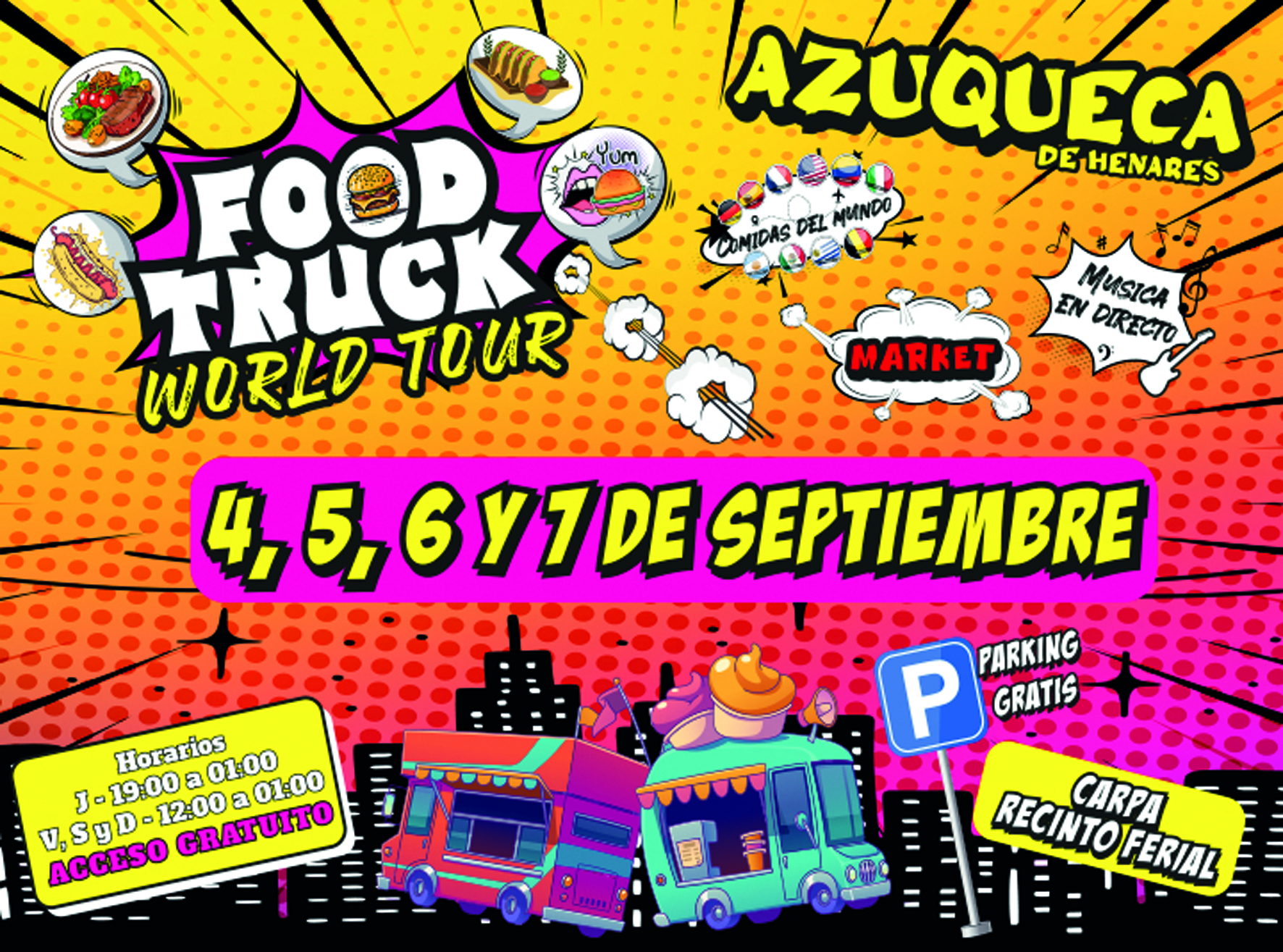 Como anticipo de las Fiestas de Septiembre, que comenzarán de manera oficial en la noche del sábado 20 con el pregón y el posterior chupinazo, Azuqueca de Henares acoge del jueves 4 al domingo 7 el evento “Food Truck World Tour”. “Durante cuatro días, se van a instalar en la carpa del Recinto Ferial puestos de comida con propuestas de diferentes lugares del mundo y sabores para todos los gustos, preparadas al momento”, explica la concejala de Fiestas, Charo Martín, quien destaca que “además, para amenizar la visita, se ha programado música en directo, además de talleres e hinchables para el público infantil”.