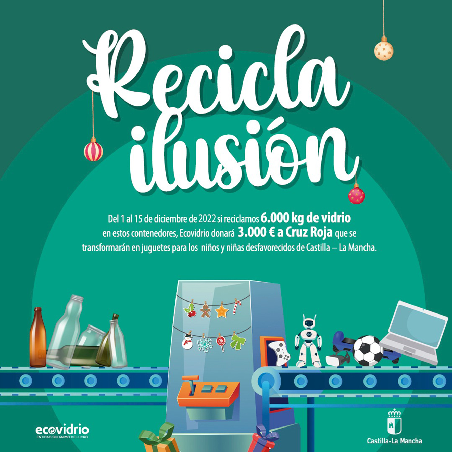 Azuqueca de Henares vuelve a participar en la campaña 'Recicla ilusión' que impulsan Ecovidrio -entidad sin ánimo de lucro encargada de la gestión del reciclado de envases de vidrio en España-, y la Junta de Comunidades de Castilla-La Mancha. El reto propone recoger en los cinco municipios de la región que participan –Azuqueca, Puertollano (Ciudad Real), Quintanar del Rey (Cuenca) y Sonseca (Toledo)- 6.000 kilos de vidrio. Si se alcanza esa cifra hasta el 15 de diciembre, Ecovidrio donará 3.000 euros a Cruz Roja para la compra de juguetes educativos destinados a niñas y niños de familias vulnerables.