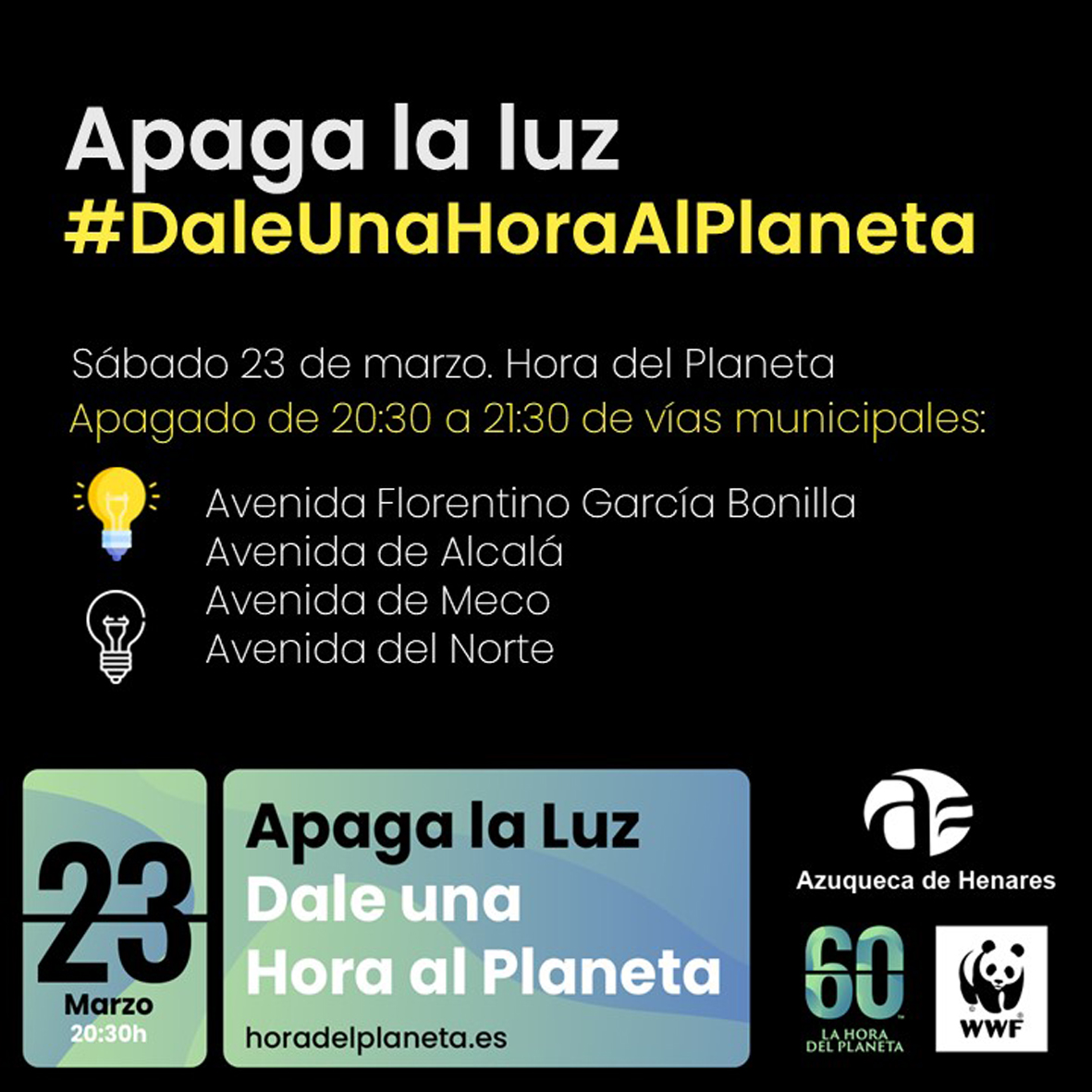 Un año más, el Ayuntamiento de Azuqueca de Henares se suma este sábado, 23 de marzo, a la Hora del Planeta, una iniciativa que impulsa el Fondo Mundial para la Naturaleza (WWF, por sus siglas en inglés) y que consiste en apagar la luz durante una hora, de 20:30 a 21:30 horas. “Se trata de un sencillo gesto con el que se pretende llamar la atención sobre el problema del cambio climático”, explica el alcalde azudense, Miguel Óscar Aparicio, quien anima a la ciudadanía a participar: “es un sencillo gesto individual que, repetido por millones de personas en distintos lugares de todo el mundo, tiene un gran impacto”.