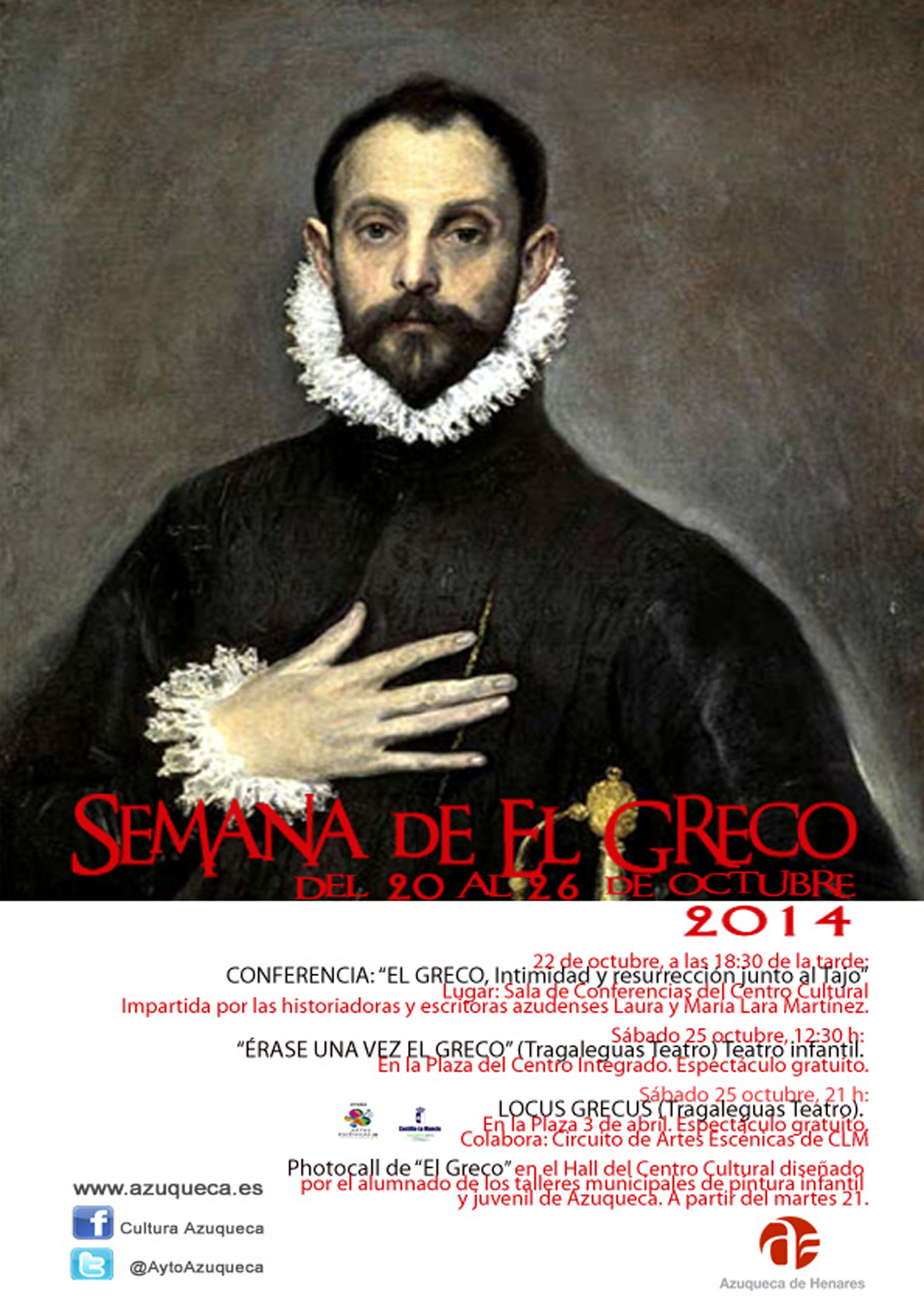Azuqueca de Henares celebra hasta el día 25 de octubre su ‘Semana de El Greco’, organizada con motivo del cuarto centenario de la muerte del pintor cretense. La concejala de Cultura, Sandra Yagüe, explica que "con el objetivo de acercar a la población la figura del artista, las historiadoras azudenses Laura y María Lara impartirán el miércoles, a las 18,30 horas, en la Casa de la Cultura, la conferencia ‘El Greco, intimidad y resurrección junto al Tajo’". Además, para el sábado, se han programado dos espectáculos gratuitos, el primero de ellos en la plaza del Centro Joven y dirigido al público infantil, con la compañía Tragaleguas Teatro y la obra 'Érase una vez El Greco', y el segundo, a cargo de la misma compañía, que pondrá en escena a partir de las 21 horas, en la plaza 3 de abril el montaje 'Locus Grecus'. Aunque inicialmente este segundo espectáculo se había programado en la plaza del Centro Joven, finalmente se ha decidido su celebración en la plaza 3 de abril por la mayor amplitud del espacio.En este programa de homenaje al Greco en Azuqueca, participan también los alumnos de los talleres municipales de Pintura con alumnos de 12 a 18 años, que han preparado cuatro tableros que harán las veces de photocall, y que permanecerán desde este martes y durante toda la semana en la entrada de la Casa de la Cultura. En uno de los tableros reproduce el célebre 'El Caballero de la mano en el pecho', en otro un retrato del hijo de El Greco, Jorge Manuel; el tercero es una reproducción de 'Magdalena penitente' y el cuarto el 'Retrato de Fray Hortensio Félix Paravicino'. Los rostros de los protagonistas de estas obras han sido cortados para permitir a los visitantes que pongan su rostro desde la parte posterior de los paneles y se fotografíen.