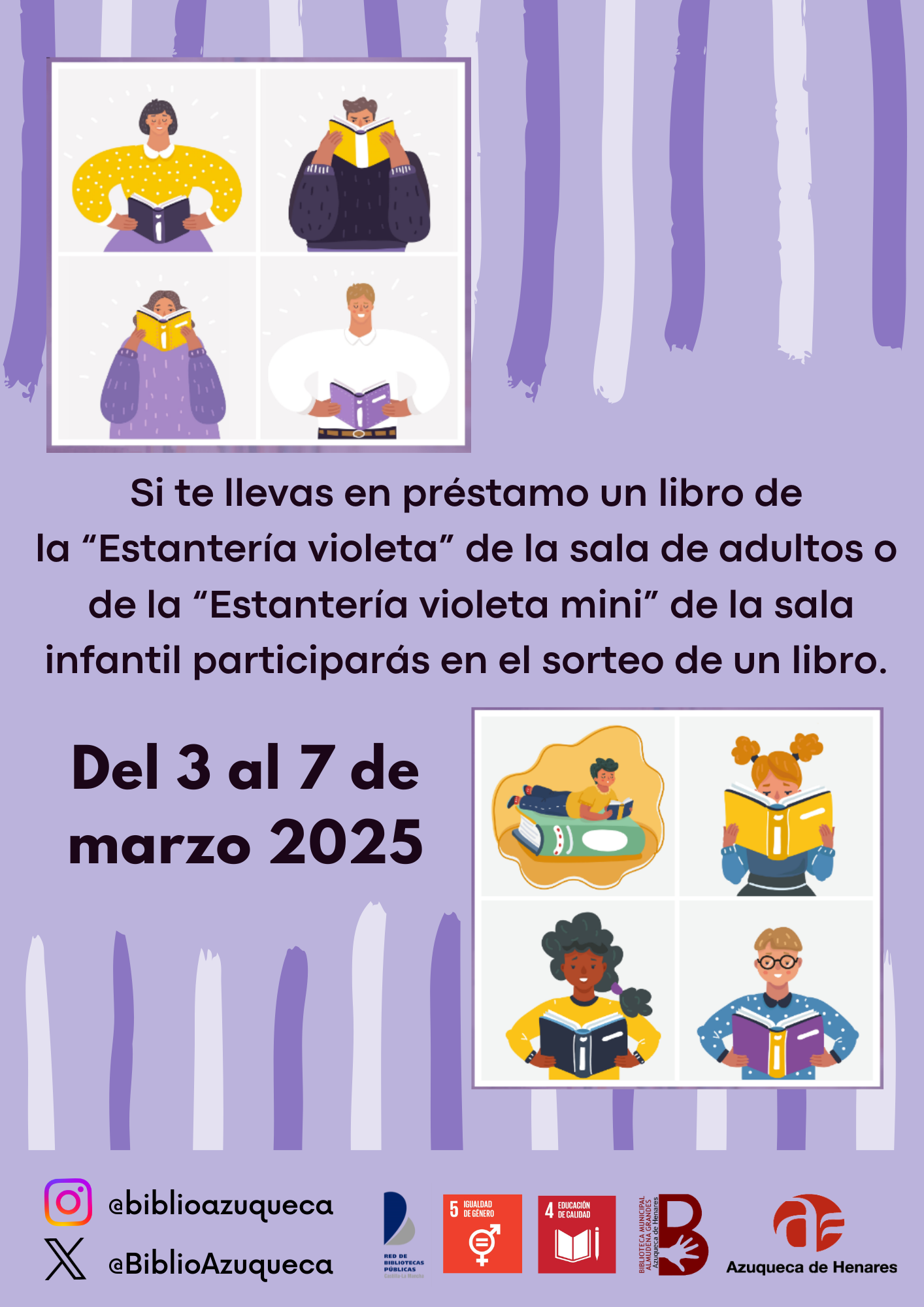 Del 3 al 7 de marzo, si te llevas en préstamo un libro de la “Estantería violeta” de la sala de adultos o de la “Estantería violeta mini” de la sala infantil participarás en el sorteo de un libro.