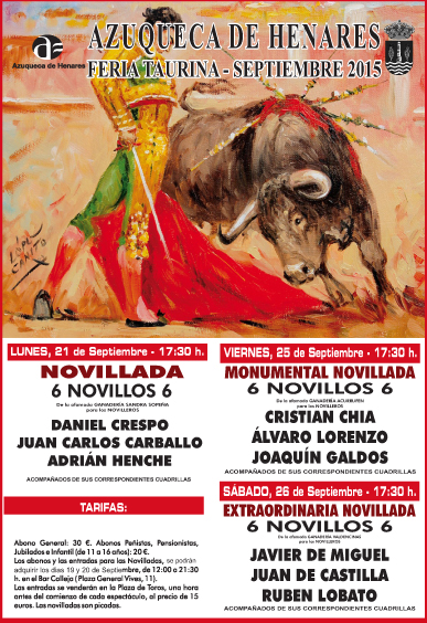 Los actos taurinos de las Fiestas de Septiembre de Azuqueca de Henares continúan el viernes 25 con la segunda de las tres novilladas programadas. El cartel de esta cita, que comienza a las 17:30 horas en la plaza instalada en el Recinto Ferial, cuenta con la participación de Cristian Chia, Álvaro Lorenzo y Joaquín Galdós, que se van a medir con seis reses de la ganadería Alcurrucén. Las entradas se pueden adquirir en taquilla al precio de 15 euros (general) y 12 euros (pensionistas, jubilados y jóvenes de 11 a 16 años).Antes del inicio de la novillada, las peñas El Bollo, Er'Biberón y Los Cachimbas irán hasta la plaza de toros acompañados de charangas, mientras que, una vez finalizada la faena, la peña La Perrera organiza la tradicional 'vaquilla de la limonada'. Previamente, por la mañana, a las 10 horas, se celebra un encierro por el recorrido habitual (por la avenida de Alcalá hasta la plaza).El programa completo de actividades de las Fiestas de Septiembre 2015 se puede consultar pinchando aquí.