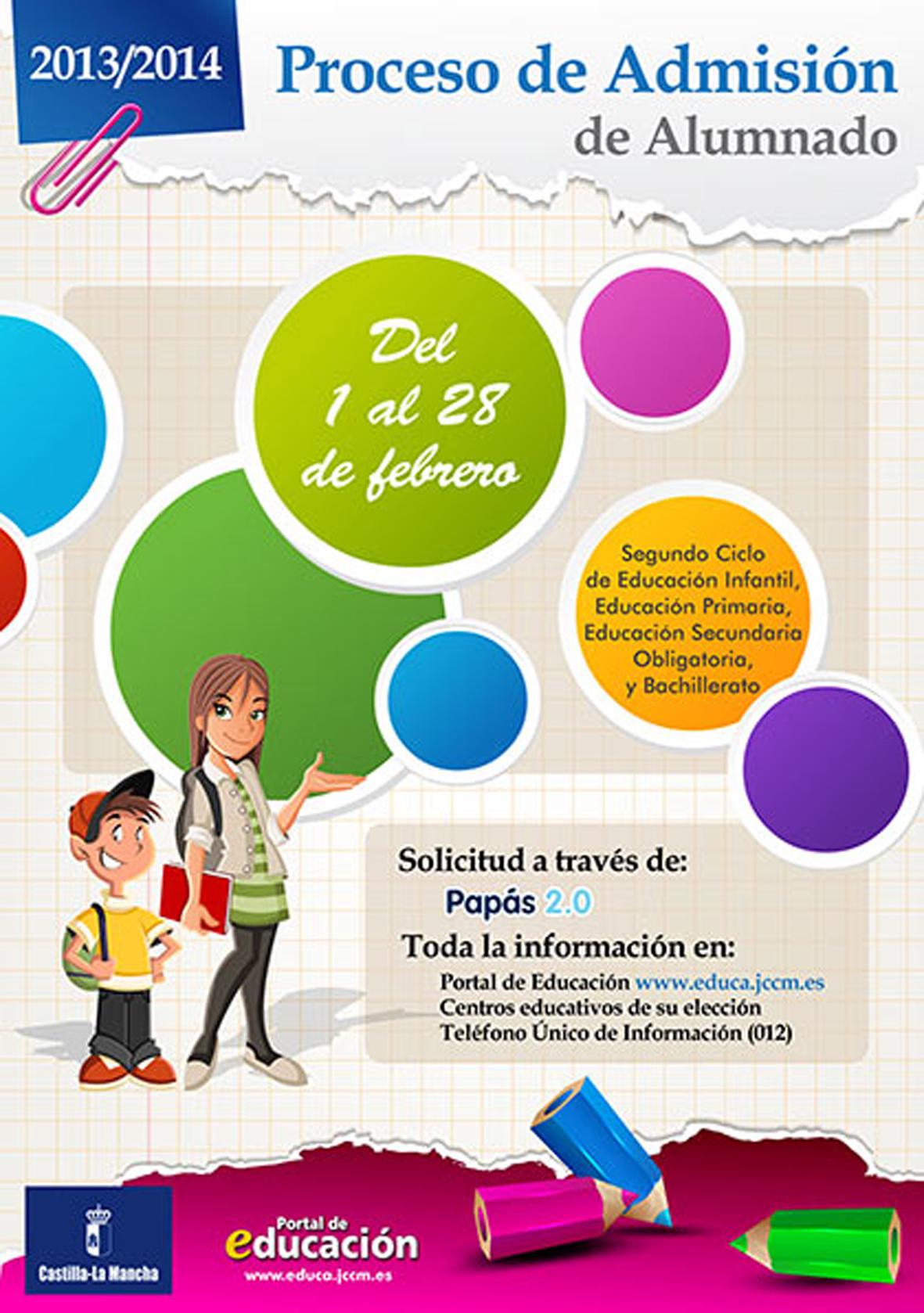 De cara al curso 2013/2014, entre el 1 y el 28 de febrero, se mantiene abierto el plazo de presentación de solicitudes para la admisión de alumnos en Educación Infantil, en Primaria, Secundaria Obligatoria y Bachillerato, tanto en centros públicos como privados concertados en Castilla-La Mancha.Los estudiantes de cuarto curso de la ESO que deseen continuar los estudios de Bachillerato en el mismo centro o en centro adscrito deben presentar un impreso de confirmación que proporciona el propio instituto. Por otra parte, los alumnos que vayan a iniciar Educación Primaria o Secundaria en el mismo centro no necesitan realizar trámite alguno.Modalidad telemática o presencialEn el resto de casos, la solicitud se puede realizar de manera telemática o presencial. Por internet, hay que acceder a la plataforma Papás (www.educa.jccm.es, en el teléfono 012 y en las secretarías de los centros.Pinche aquí para ver el listado de colegios e institutos de Azuqueca de HenaresPinche aquí para consultar la 'Guía para padres' editada por la Junta de Comunidades de Castilla-La Mancha