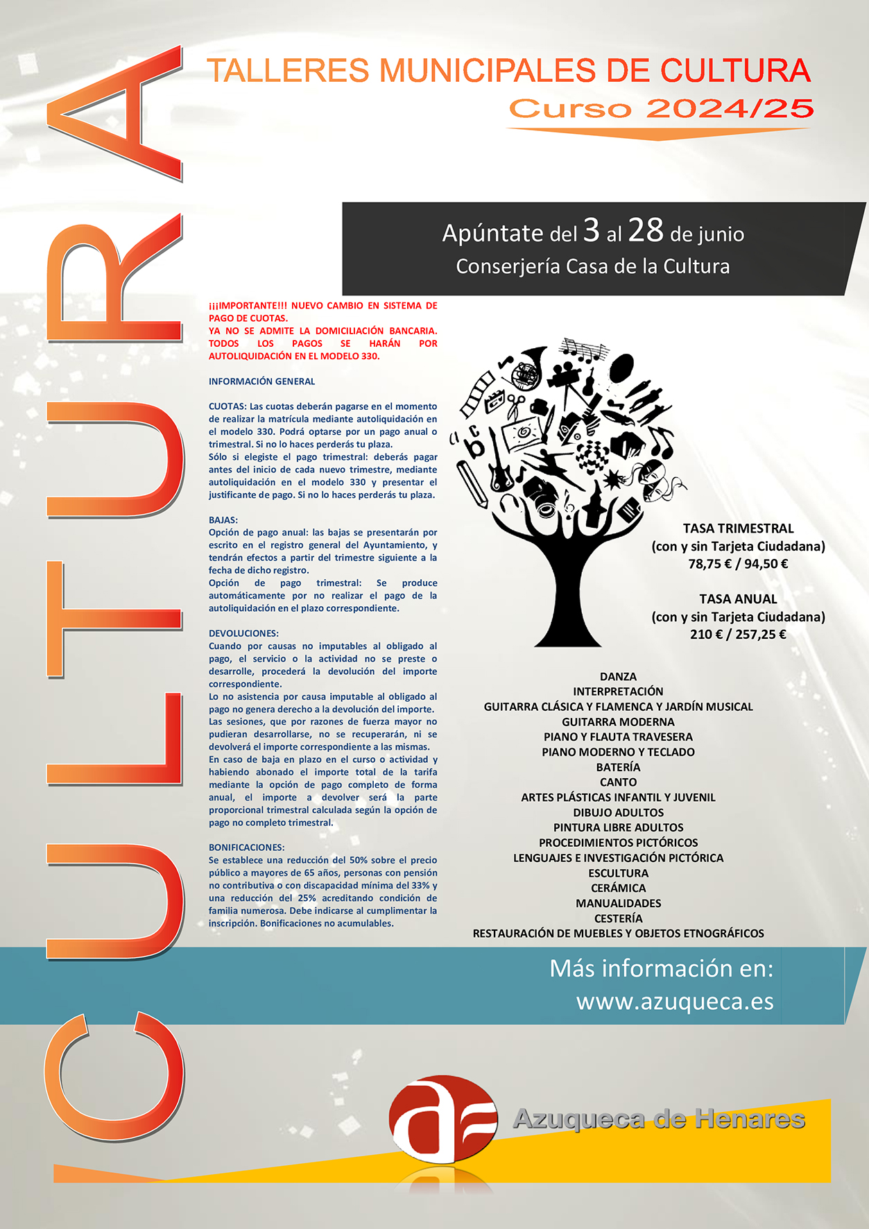 Desde el próximo lunes, 3 de junio, y hasta el último viernes de mes, día 28, se mantendrá abierta la preinscripción en los talleres de Cultura que organiza el Ayuntamiento de Azuqueca de Henares, de cara al próximo curso, 2024/25. La oferta incluye enseñanzas de danza, interpretación, guitarra clásica y flamenca y jardín musical, guitarra moderna, piano y flauta travesera, piano moderno y teclado, batería, canto, artes plásticas (infantil y juvenil), dibujo (adultos), procedimientos pictóricos, lenguajes e investigación pictórica, escultura, cerámica, manualidades, cestería y restauración de muebles y objetos etnográficos.