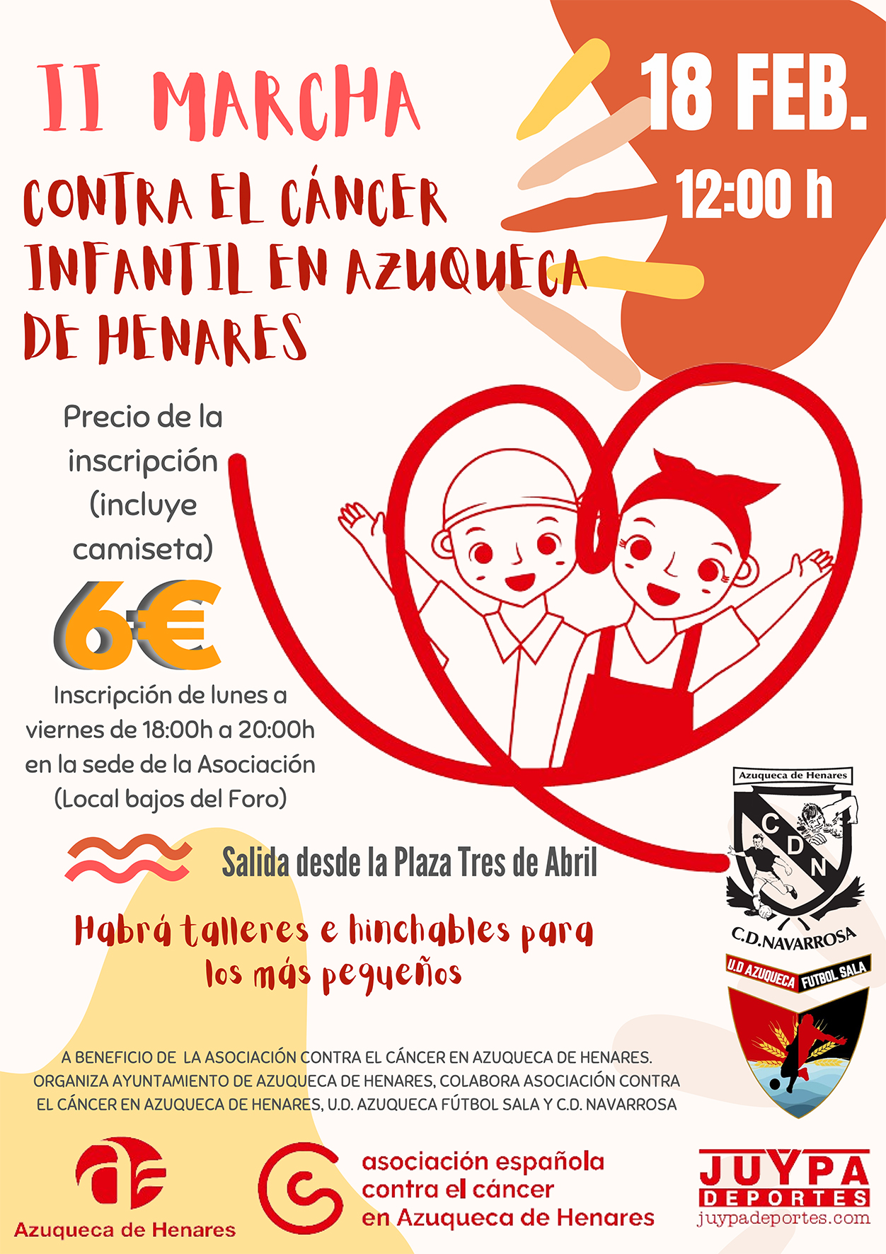 El Ayuntamiento de Azuqueca de Henares ha programado para el domingo 18 de febrero la segunda edición de la Marcha contra el cáncer infantil en Azuqueca de Henares, a beneficio de la Asociación Española contra el Cáncer (AECC) en la ciudad. La salida se ha programado a las 12 del mediodía desde la plaza 3 de Abril. El recorrido tendrá 3,5 kilómetros de longitud, por varias calles de la ciudad, hasta finalizar en el mismo punto de partida.