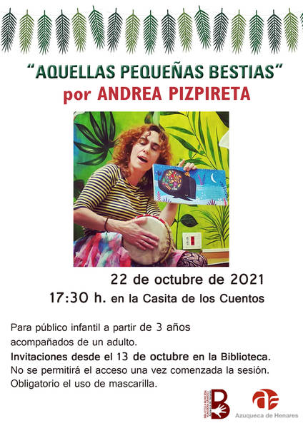 Desde este miércoles, 13 de octubre, se pueden retirar en la sala infantil de la Biblioteca por las tardes, de 16 a 20 horas, las invitaciones para asistir a la sesión de narración oral del viernes 22 de octubre. Andrea Pizpireta presentará 'Aquellas pequeñas bestias', para niños y niñas a partir de 3 años, en la Casita de los Cuentos Eva Ortiz a partir de las 17:30 horas (uso obligatorio de mascarilla).