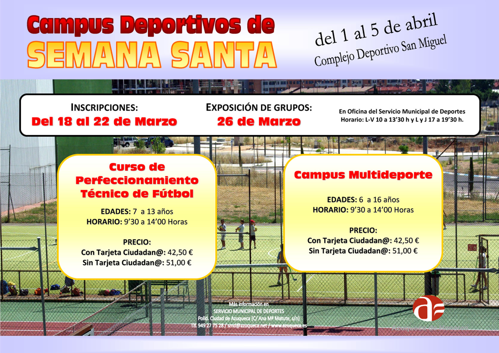 A lo largo de esta semana, hasta el viernes 22 de marzo, está abierto el plazo de inscripción en las dos actividades deportivas organizadas por el Ayuntamiento de Azuqueca coincidiendo con las vacaciones escolares de Semana Santa. "La oferta es similar a la que lanzamos con el Azuverano, durante las vacaciones estivales", explica el concejal de Deportes, José Luis Escudero.El programa, que se desarrollará entre los días 1 y 5 de abril, de 9,30 a 14 horas, en el Complejo Deportivo San Miguel, incluye un curso de perfeccionamiento técnico del fútbol (dirigido a niños y jóvenes de 7 a 13 años) y un Campus multideporte (de 6 a 16 años). Los interesados en la inscripción deben realizar la autoliquidación correspondiente (abonando 42,50 euros en caso de ser titulares de Tarjeta Ciudadan@ y 51 euros, si no lo son) en el Servicio Municipal de Deportes (polideportivo ‘Ciudad de Azuqueca’, de lunes a viernes de 10 a 13,30 horas, y de lunes y jueves también de 17 a 19,30 horas; correo electrónico: