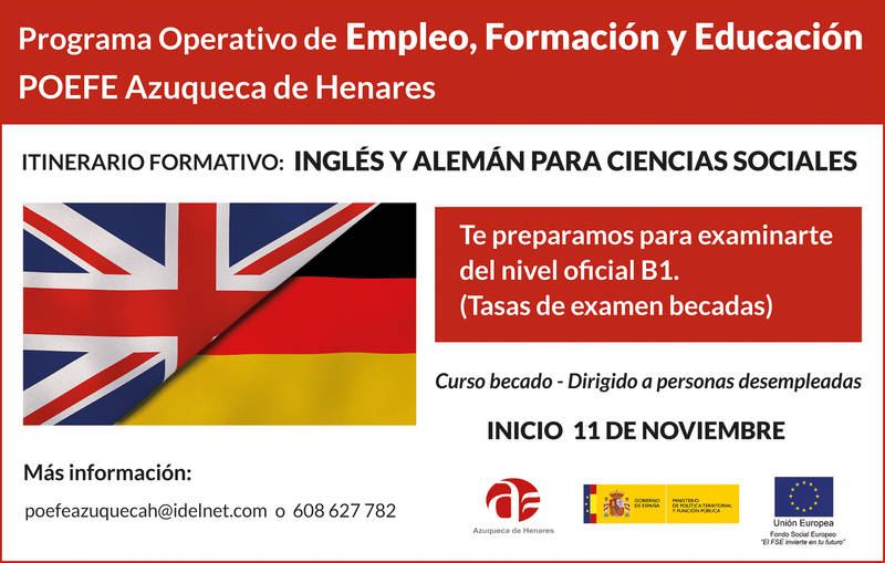 Hasta el lunes 8 de noviembre, está abierta la inscripción en el itinerario formativo 'Inglés y Alemán para Ciencias Sociales'’, incluido en la programación del POEFE (Programa Operativo de Empleo, Formación y Educación) de Azuqueca de Henares y que comenzará a impartirse el 11 de noviembre. Con 600 horas de formación, el curso -gratuito para los participantes- incluye los derechos de examen para obtener la titulación correspondiente al nivel B1 de los idiomas.