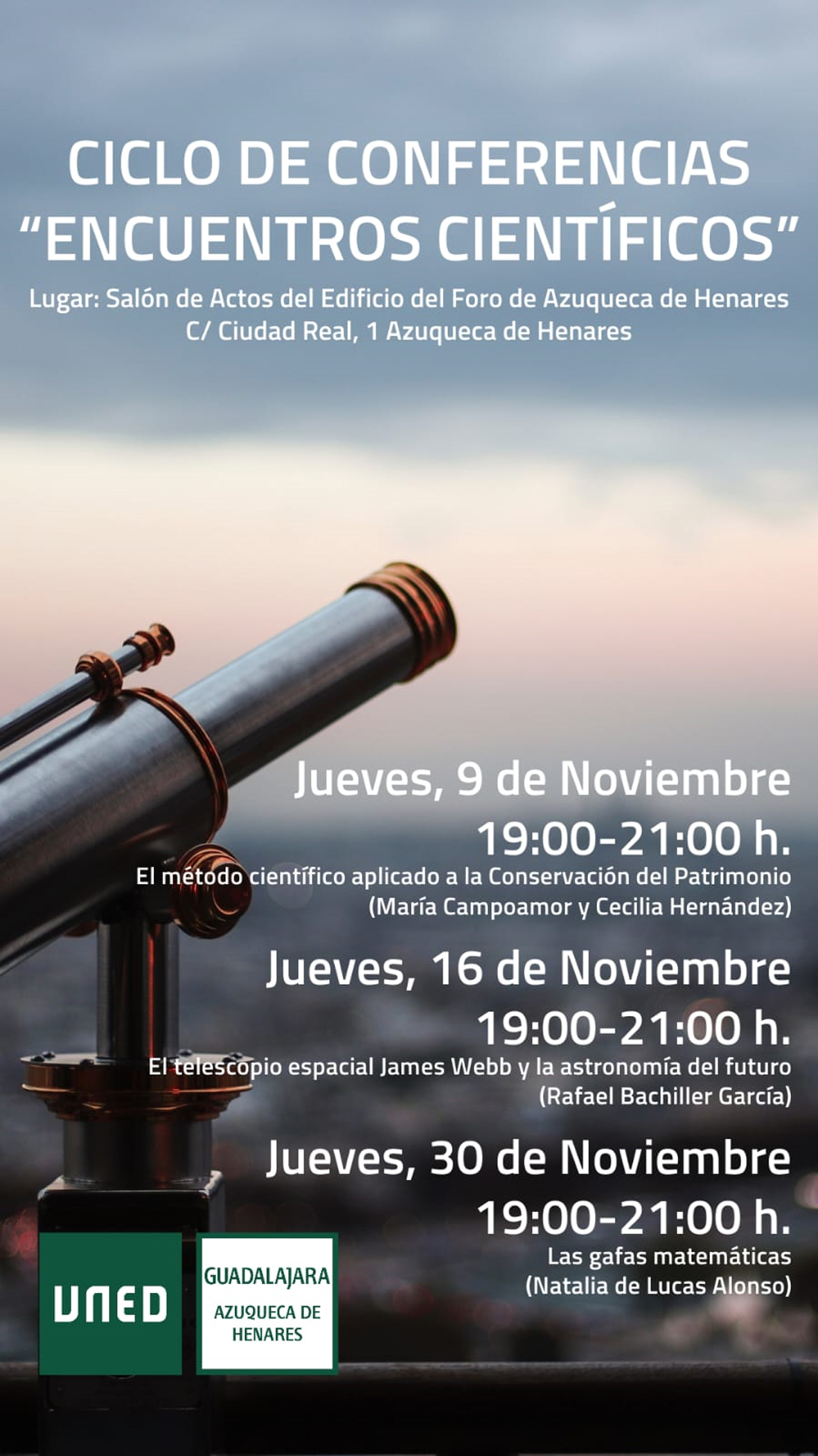 El ciclo consta de tres conferencias de dos horas de duración en las que se abordarán distintos aspectos de la ciencia. Todas las sesiones comienzan a las 19 horas en el salón de actos del Learning Center (c/ Ciudad Real, 1). La asistencia es gratuita y se recomienda inscribirse previamente en el número de teléfono 949 215 260 y en el correo electrónico info@guadalajara.uned.es.