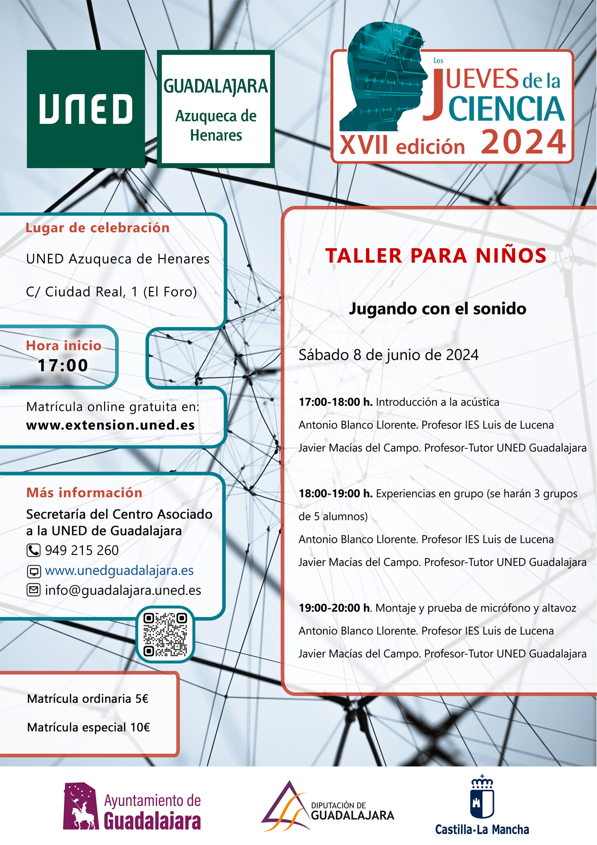 La sesión contará con la presencia de Antonio Blanco, profesor del IES Luis de Lucena de Guadalajara, y Javier Macías, profesor-tutor de UNED Guadalajara. El taller se divide en tres partes: de 17 a 18 horas, Introducción a la acústica; de 18 a 19 horas, Experiencias en grupo (5 personas) y, por último, de 19 a 20:30 horas, Montaje y prueba de micrófono y altavoz.