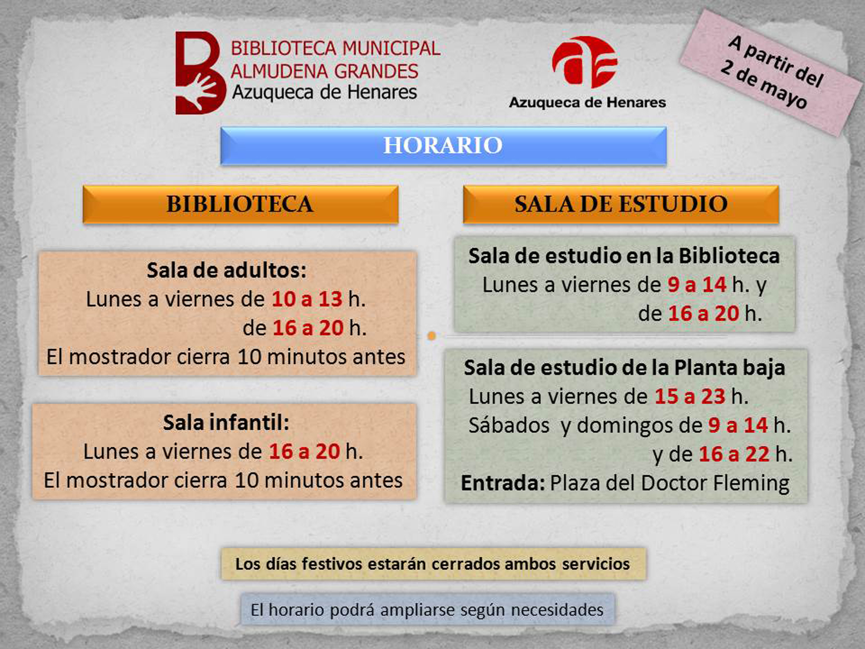 A partir del jueves 2 de mayo –el miércoles 1 es festivo nacional-, la sala de la planta baja abre de lunes a viernes de 15 a 23 horas y los sábados y domingos, de 9 a 14 y de 16 a 22 horas. Además también hay un espacio para el estudio en la primera planta, en la sala de adultos, que funciona de lunes a viernes de 9 a 14 y de 16 a 20 horas.