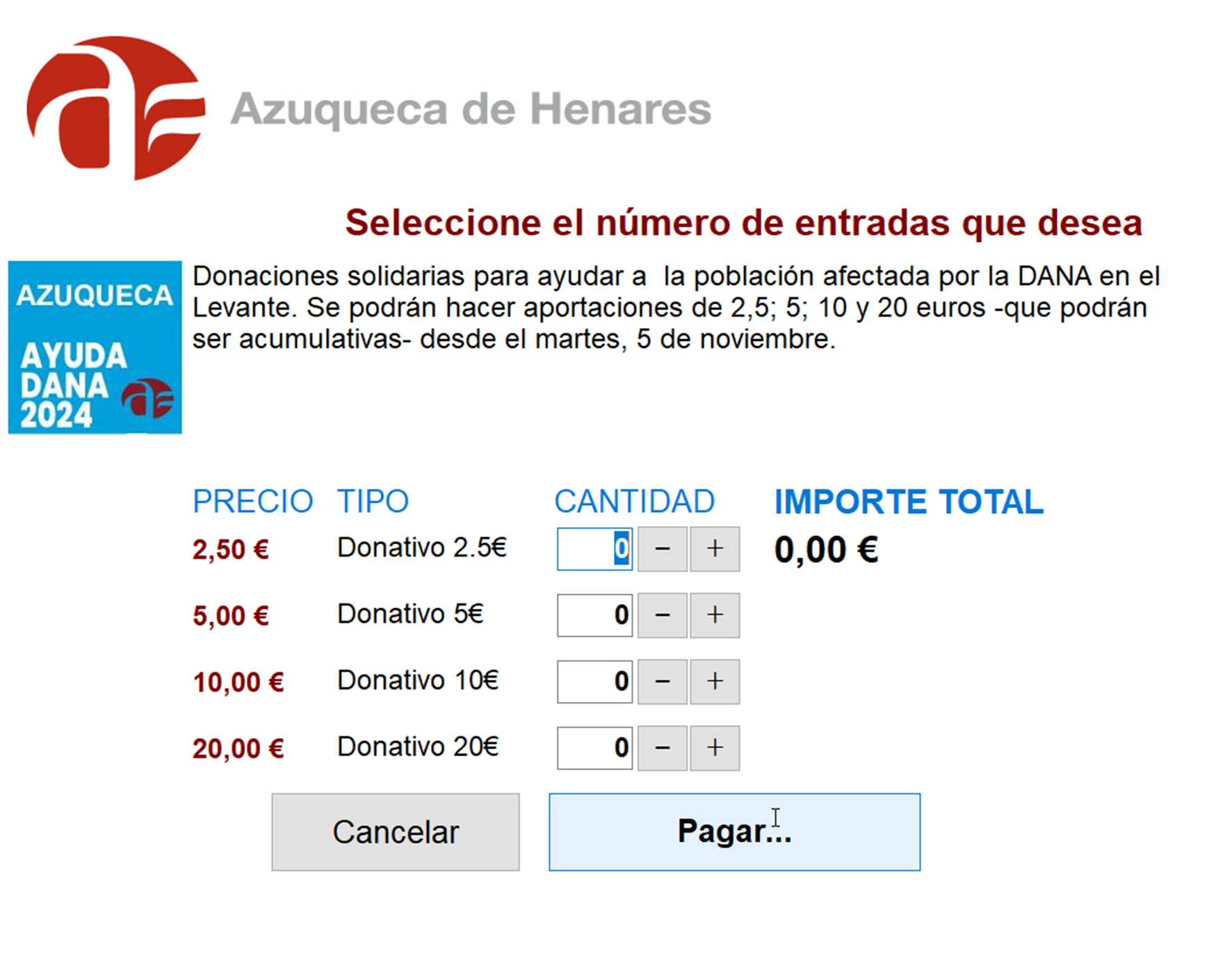 Desde este martes, el Ayuntamiento de Azuqueca de Henares ha habilitado un sistema para gestionar la ayuda económica que la ciudadanía de Azuqueca de Henares desee destinar a las personas afectadas por las inundaciones provocadas por la DANA que arrasó varias localidades valencianas hace una semana. Tanto a través de los cajeros ciudadanos (instalados en el Ayuntamiento, la Casa de la Cultura, el EJE, el Centro de Ocio, el Foro y el polideportivo Ciudad de Azuqueca) como a través de esta página web (AQUÍ), se pueden hacer aportaciones en cuantías de 2,5; 5; 10 o 20 euros, tantas como se desee y por cualquiera de los dos canales.