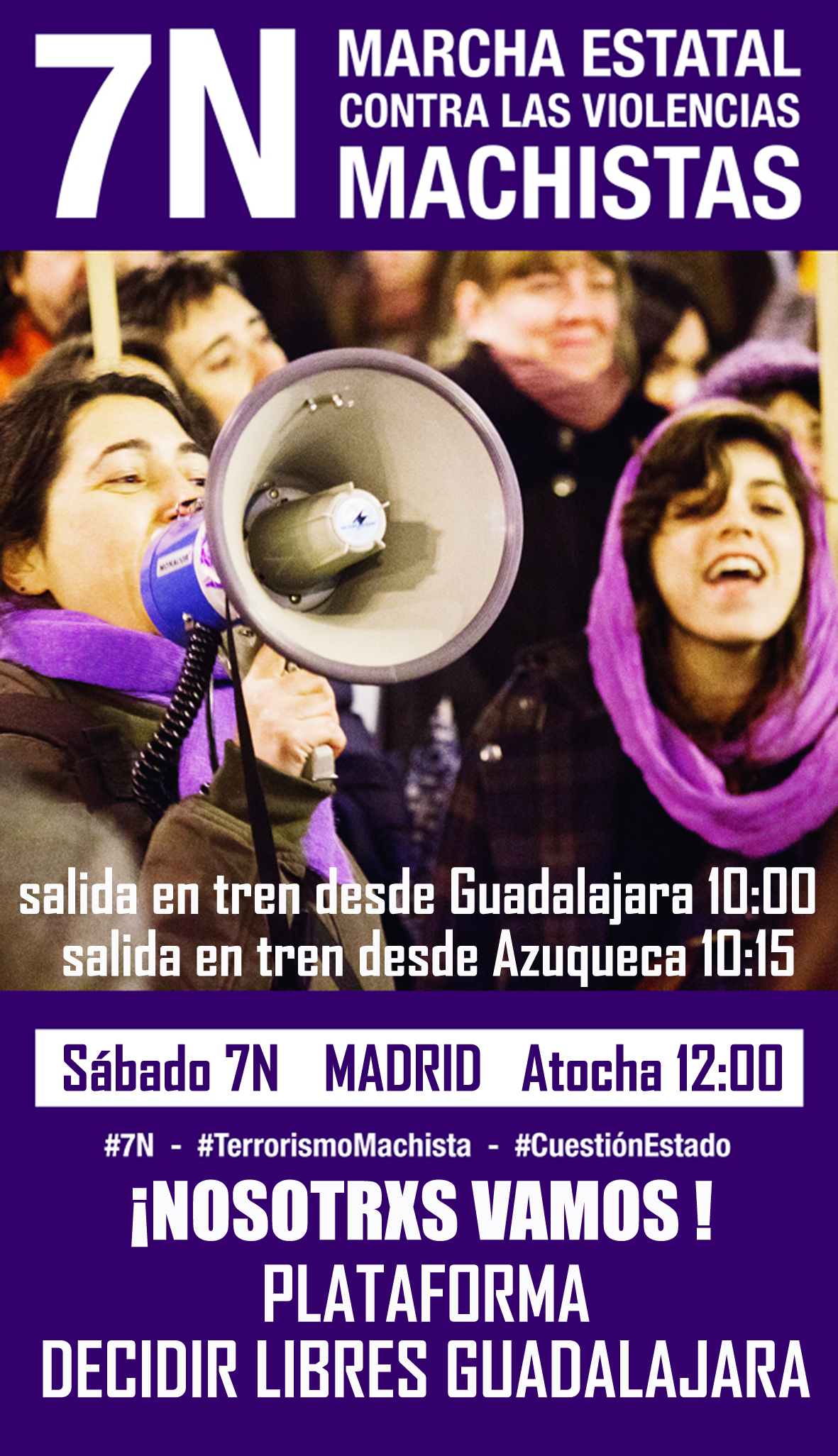 Este sábado, 7 de noviembre, se celebra en Madrid la Marcha Estatal contra las Violencias Machistas, una iniciativa a la que se ha adherido el Ayuntamiento de Azuqueca de Henares, a propuesta del Consejo Local de Igualdad. La concejala del área, Carmen Luque, anima a los vecinos y vecinas a participar en esta Marcha y recuerda que se ha organizado una salida conjunta desde Guadalajara que pasa por Azuqueca. En este sentido, las personas interesadas deben acudir a las 10:15 horas a la estación de cercanías de la localidad para tomar el tren.La edil de Igualdad explica que "el balcón del Ayuntamiento luce desde hace unos días una pancarta que, con el lema '7N: Azuqueca contra las Violencias Machistas', pretende mostrar el apoyo municipal a esta iniciativa, al tiempo que se sensibiliza a la población sobre esta lacra". La pancarta se instaló en la tarde del martes 3 de noviembre y contó con la participación de representantes del Consejo Local de Igualdad.La marcha sale a las 12 horas del Ministerio de Sanidad, Servicios Sociales e Igualdad (Paseo del Prado, 18) y finaliza en la Plaza de España, después de pasar por la plaza de Cibeles y la Gran Vía. El objetivo es conseguir que la sociedad tome conciencia de la gravedad de la violencia machista, "la manifestación más violenta de la desigualdad de género y la más grave violación de los derechos humanos de las mujeres", según recoge el manifiesto de este movimiento, que cuenta en Twitter con la etiqueta #YoVoy7N.