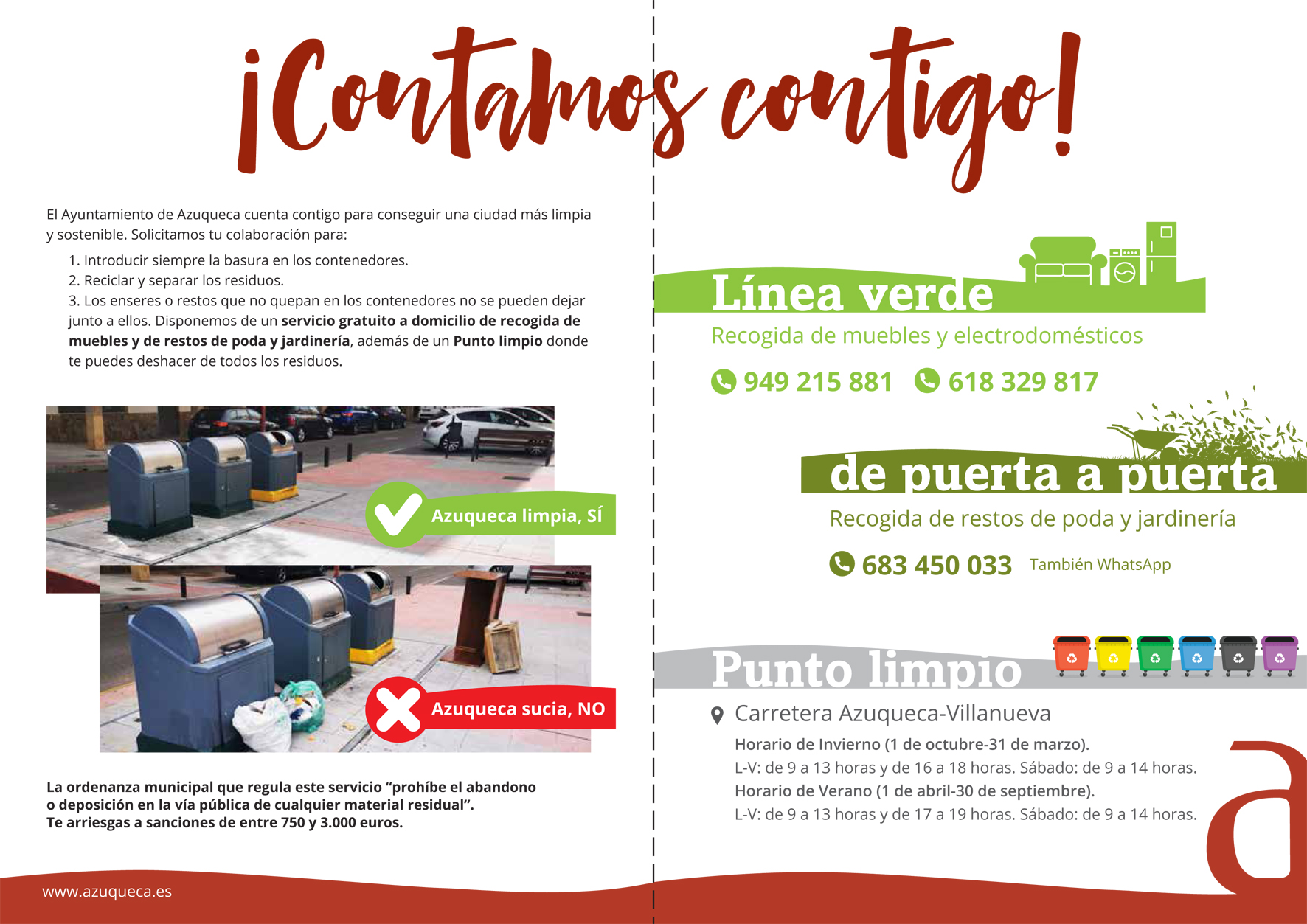 Con el lema 'La basura dentro, tu ciudad limpia', el Ayuntamiento de Azuqueca de Henares ha puesto en marcha una campaña especial de limpieza. "El objetivo es concienciar a la ciudadanía de la importancia de depositar las bolsas de residuos en el interior de los diferentes contenedores", explica el concejal de Economía Circular, Sergio de Luz, quien solicita la colaboración de los vecinos y vecinas para "conseguir una ciudad más limpia y sostenible".Para la campaña, el Ayuntamiento ha editado distintos materiales. "Hemos comenzado a colocar quince postes informativos en las paradas más conflictivas, es decir, aquellas donde se ha detectado un mal uso de los contenedores de manera reincidente", señala. También se van a colocar 500 adhesivos en las bocas de los contenedores y se van a repartir mil dípticos."Dejar las bolsas fuera de los cubos no solo genera una imagen de dejadez y suciedad, sino que también facilita la proliferación de plagas y malos olores y dificulta y retrasa las labores de recogida, ya que obliga a los operarios a invertir más tiempo en cada punto", explica el edil. Sergio de Luz recuerda que "la ordenanza municipal prohíbe expresamente el abandono o deposición en la vía pública de cualquier material residual" y se establecen sanciones por un importe comprendido entre los 750 y los 3.000 euros."También es importante que cada hogar realice una correcta separación de los residuos, ya sean orgánicos, plásticos, vidrio, papel u otros, para su posterior reciclaje", apunta. "Los enseres y restos que no quepan en los contenedores no se pueden dejar junto a ellos y, para esos casos, contamos con servicios especiales", insiste el responsable municipal de Economía Circular.Servicios especialesEn este sentido, el Ayuntamiento de Azuqueca dispone del servicio 'De puerta a puerta' para la recogida de restos de poda y jardinería. Se puede concertar una cita llamando al número de teléfono 683 450 033 -también se admiten mensajes a través de la aplicación de WhatsApp-.Por su parte, la Mancomunidad Vega del Henares cuenta con una Línea Verde para solicitar la recogida de muebles y electrodomésticos a través de los teléfonos 949 215 881 y 618 329 817.Además, el Punto Limpio de la Mancomunidad admite todo tipo de residuos. Se ubica en la carretera de Azuqueca a Villanueva y su horario es el siguiente: del 1 a abril al 30 de septiembre, de lunes a viernes, de 9 a 13 y de 17 a 19 horas y los sábados, de 9 a 14 horas; y del 1 de octubre al 31 de marzo, de lunes a viernes, de 9 a 13 y de 16 a 18 horas y los sábados de 9 a 14 horas.