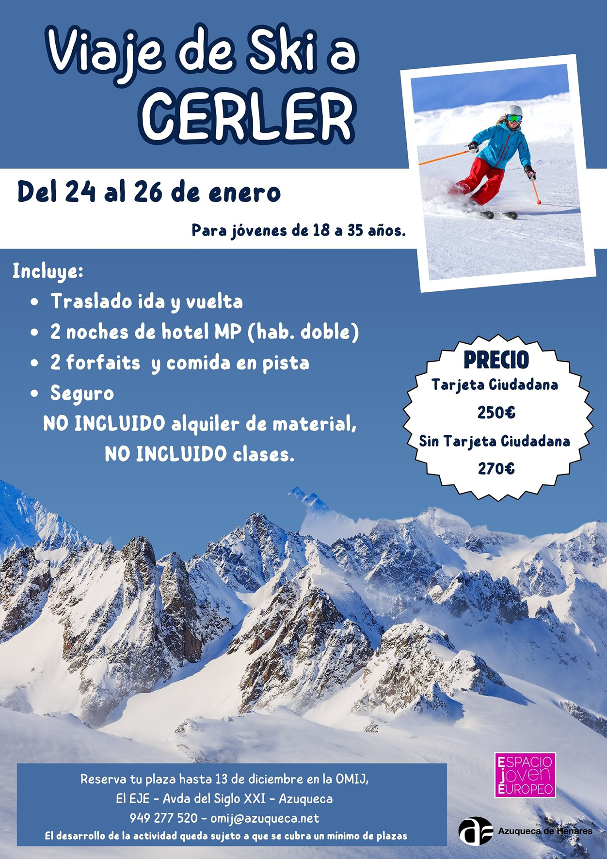 El Ayuntamiento de Azuqueca de Henares ha organizado un viaje para practicar esquí dirigido a jóvenes de 18 a 35 años. Los participantes se desplazarán a la estación aragonesa de Cerler el día 24 de enero y volverán el día 26.