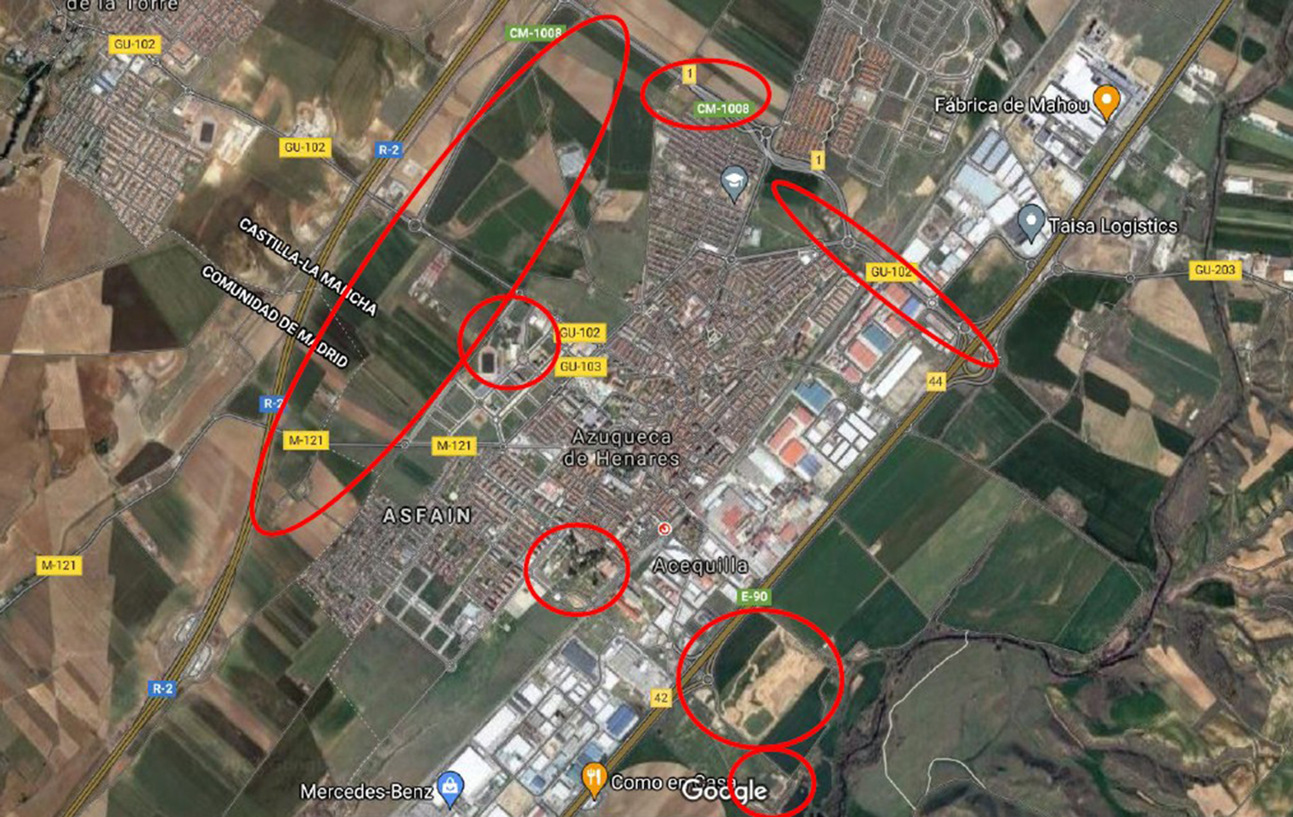 En rojo, las zonas identificadas como más favorables para la presencia de insectos en Azuqueca de Henares