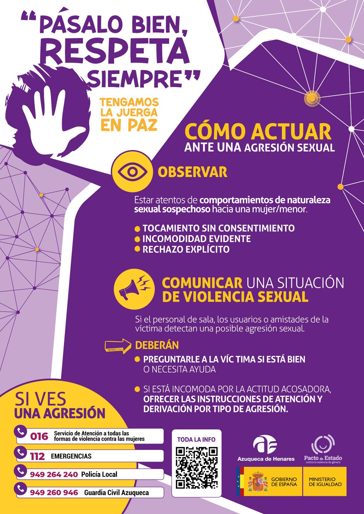 Asimismo, repasa los teléfonos disponibles para avisar o denunciar una agresión: 016 (servicio de atención a todas las formas de violencia contra las mujeres), 112 (Emergencias), 949 264 240 (Policía Local) y 949 260 946 (Guardia Civil de Azuqueca 24 horas). También se incluye el número del Centro de la Mujer de Azuqueca (949 277 346) y de la Línea de Ayuda Permanente (900 100 114).
