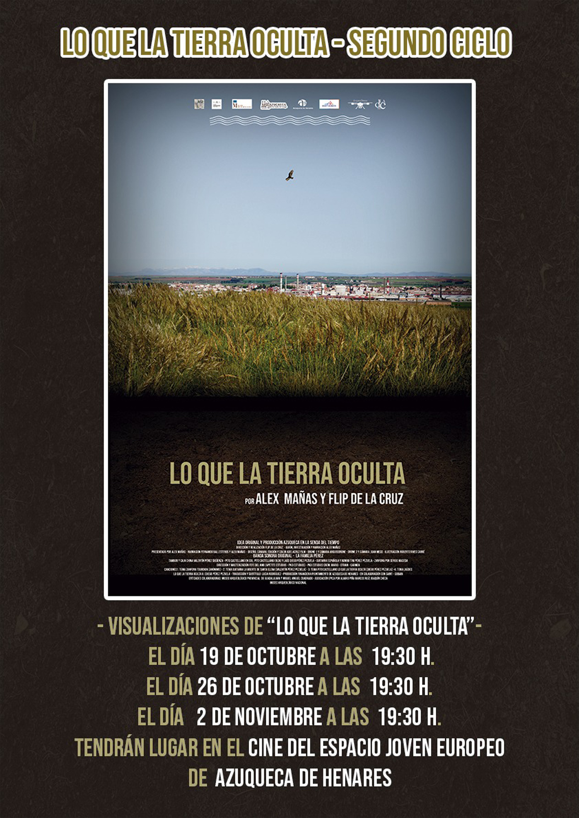 Este sábado, 19 de octubre, comienza un segundo ciclo de proyecciones del documental “Lo que la tierra oculta” y que se completa con dos sesiones más, el 26 de octubre y el 2 de noviembre, todas ellas, con inicio a las 19:30 horas en la sala de cine del Espacio Joven Europeo (EJE). El artista cinematográfico Sergio de la Cruz Gómez y el arqueólogo Alejandro Mañas-García han desarrollado este proyecto a través de la asociación Azuqueca en la Senda del Tiempo y con financiación del Ayuntamiento y de la empresa local Saint Gobain Isover Ibérica, S.L.