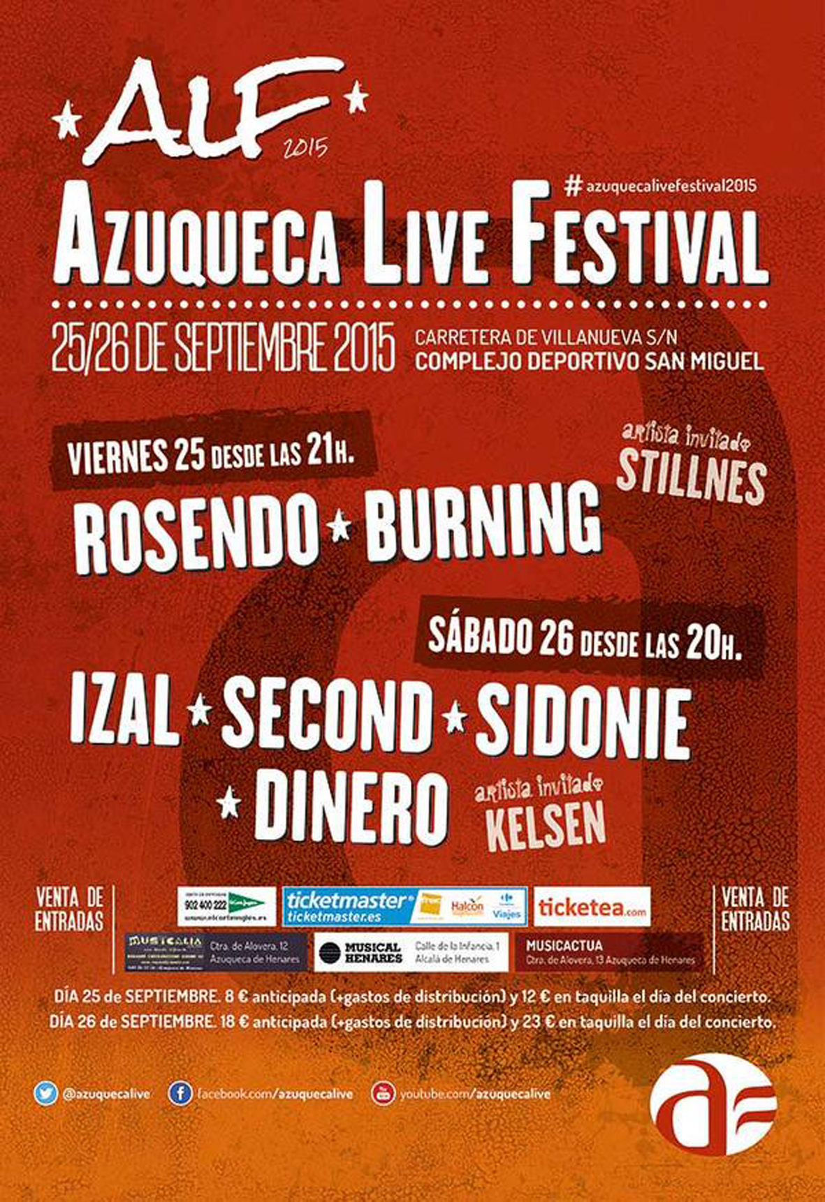 El Azuqueca Live Festival (ALF) ha sido nominado por los Premios Fest 2015 en tres categorías: Mejor Festival Revelación, Mejor Campaña de Comunicación y Mejor Producción. Este evento musical forma parte de la programación de Fiestas de Septiembre y se desarrollará los días 25 y 26 en el campo de fútbol San Miguel. En su primera jornada, el ALF ofrece la actuación de Rosendo y Burning, mientras para el sábado 26 se ha previsto una jornada indie con Izal, Second, Sidonie y Dinero. La concejala de Fiestas, Charo Martín, ha mostrado su satisfacción por estas nominaciones y ha recordado que las entradas se pueden comprar anticipadamente en Musicalia (carretera de Alovera, 12), Musicactúa (carretera de Alovera, 13) y en Musical Henares (C/ de la Infancia, 1, Alcalá de Henares). La venta electrónica se canaliza a través de las páginas web de El Corte Inglés (pinche AQUÍ), Ticketea (AQUÍ) y Ticketmaster (AQUÍ).Las entradas para ver a Rosendo, Burning (teloneados por el grupo local Stillnes) cuestan 8 euros en venta anticipada y 12 euros en taquilla, mientras que las de las jornada del día 26, para Izal, Second, Sidonie y Dinero (con Kelsen como teloneros) se pueden comprar por 18 y 23 euros respectivamente. A estos precios, hay que sumar los gastos de gestión de cada distribuidor. Los Premios Fest, que este año celebran su segunda edición, son una iniciativa de Bythefest.com y la Asociación de Promotores de Música de España, APM, en colaboración con Radio 3. La convocatoria surgió, según se explica en la página web de los premios para "reconocer, valorar, celebrar el trabajo y la creatividad de los profesionales responsables del desarrollo de los Festivales de Música que se celebran en España" y convertirse en un "sello de calidad de referencia internacional".Los premios se conceden mediante el voto de seguidores y un jurado de expertos en diferentes áreas del sector. Las votaciones se harán entre el 22 de septiembre y el 7 de octubre para anunciar los finalistas el día 13 de octubre y cerrar la convocatoria con la entrega de los premios el día 28 de octubre.