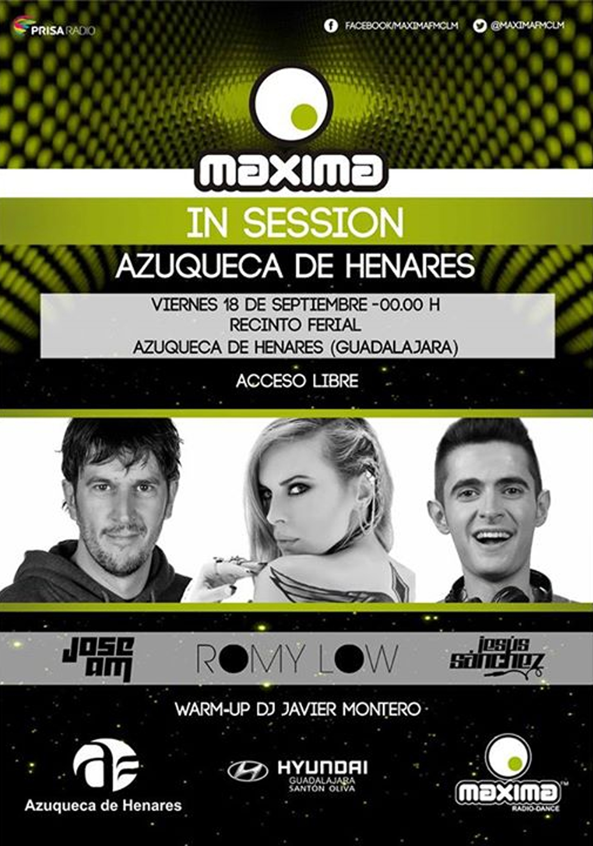 Por segundo año consecutivo, el Ayuntamiento de Azuqueca de Henares y la emisora de radio Máxima FM organizan este viernes 18, desde la medianoche, el concierto 'Máxima FM-In Session' en la carpa del Recinto Ferial. Esta edición de 2015, contará con la presencia de los DJ de la emisora de música dance Jose AM y Jesús Sánchez y la actuación especial de Romy Low.Esta propuesta reunió el año pasado a cerca de 5.000 personas en Azuqueca y "sirve de prólogo a nuestra Semana Grande, que arranca el sábado 19, a las 21:30 horas, con el pregón y posterior chupinazo desde el balcón del Ayuntamiento y se prolonga hasta el domingo 27", señala la concejala de Fiestas, Charo Martín, quien recuerda que "esta es la primera de numerosas citas musicales, entre las que destaca el Azuqueca Live Festival (ALF) de los días 25 y 26 de septiembre". En este sentido, el ALF ofrece el viernes 25, a las 21 horas, la actuación de Rosendo y Burning, con los azudenses Stillnes como artistas invitados, mientras que el sábado 26, desde las 20 horas, es el turno de Izal, Second, Sidonie y Dinero, a los que se suman como artistas invitados la banda local Kelsen. En ambos casos, el escenario se instalará en el campo municipal de fútbol del complejo San Miguel. Más información sobre precios y puntos de venta, pinchando aquí. Más actos prefestivosDe manera previa al inicio de las Fiestas, también el viernes 18, a las 19 horas, se celebra una sesión extraordinaria del Pleno del Ayuntamiento de Azuqueca para nombrar al Popular del Año y homenajear a las peñas coincidiendo con el 40 Desfile de Carrozas.Además, a las 20 horas de este viernes, hay una doble cita. En la Casa de la Cultura, hay una actuación del grupo rociero Nuevo Amanecer, mientras que en el complejo San Miguel se disputa la Supercopa de Fútbol 7 entre los equipos Shout Down Tapa Local (campeón de la liga de Primera División) y Rayo Vaticano (campeón de Copa).