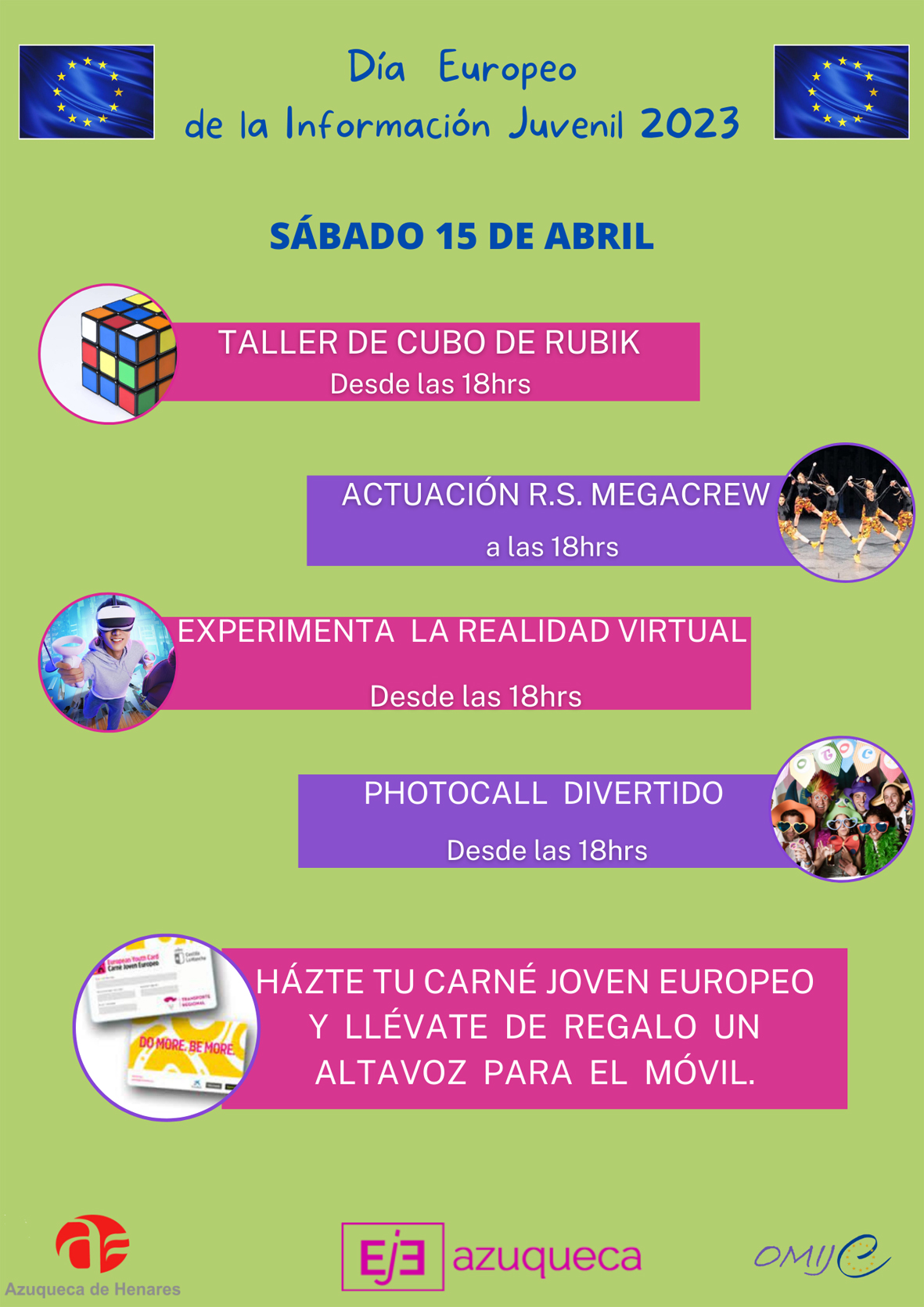 Con motivo del Día Europeo de la Información Juvenil 2023, que se celebra cada 17 de abril, el Ayuntamiento de Azuqueca de Henares organiza este sábado 15 en la plaza del Espacio Joven Europeo (EJE) una jornada de actividades gratuitas y abiertas principalmente a un público joven.
