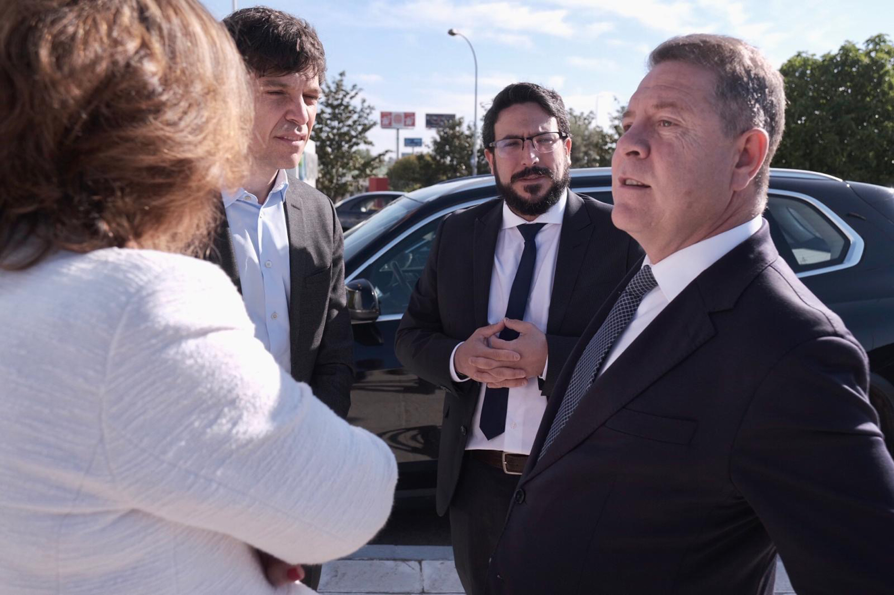 De derecha a izquierda, el presidente de Castilla-La Mancha, el alcalde azudense y el CEO de la empresa conversan con la consejera de Economía, Empresas y Empleo (de espaldas)