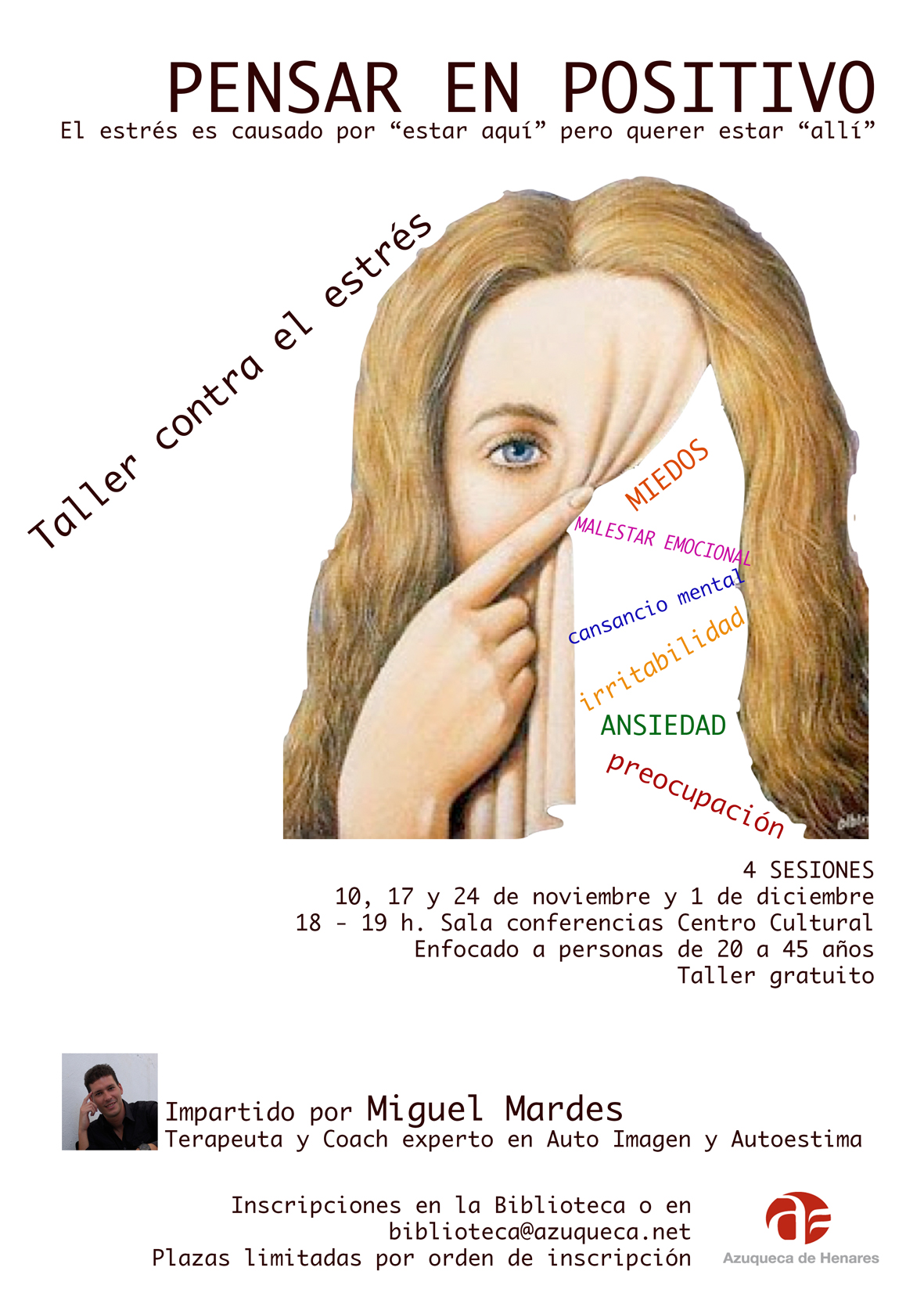 Bajo el lema 'Pensar en positivo', la sala de conferencias de la Casa de la Cultura de Azuqueca de Henares acoge durante el mes de noviembre un taller contra el estrés, que va a impartir Miguel Mardes, terapeuta y coach. La actividad, que organiza el Ayuntamiento a través de la Biblioteca Municipal Almudena Grandes, es gratuita y se dirige a adultos con edades comprendidas entre los 20 y los 45 años.El taller se compone de cuatro sesiones que comienzan el martes día 17 de noviembre y continúa hasta el 15 de diciembre, en horario de tarde, de 18 a 19 horas. El objetivo es ofrecer a los asistentes técnicas y herramientas para aprender a afrontar el estrés.Las plazas son limitadas y se adjudicarán por orden de inscripción. Las personas interesadas pueden formalizar su participación en la Biblioteca Municipal y en el coreo electrónico