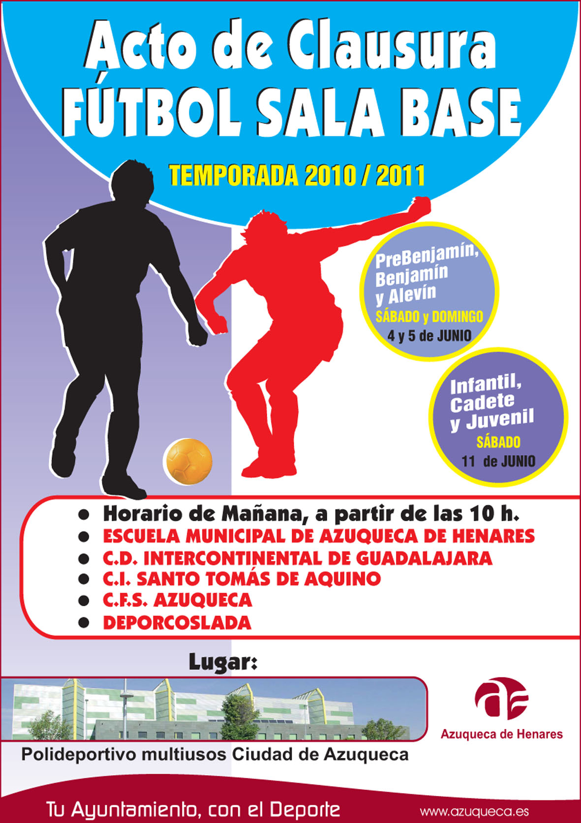 El Torneo de Fútbol Sala Base organizado por el Ayuntamiento de Azuqueca de Henares con motivo del final de la temporada 2010/2011 celebrará los encuentros de las categorías Infantil, Cadete y Juvenil el sábado 11 de junio, mientras los días 4 y 5 se disputarán los encuentros correspondientes a Prebenjamín, Benjamín y Alevín. Todos los partidos se desarrollarán en el polideportivo multiusos Ciudad de Azuqueca.En este torneo participarán, además de la Escuela Municipal de Azuqueca de Henares, el C.D. Intercontinental de Guadalajara, el C.I. Santo Tomás de Aquino, el CFS Azuqueca y el Deporcoslada. Los encuentros se disputarán en horario de mañana, a partir de las 10."Se trata de un acto especial, para despedir la temporada de los alumnos de la Escuela Municipal y el objetivo, por encima de la competición y de los resultados, es lograr que los chavales pasen un rato divertido practicando su deporte favorito", afirma José Luis Escudero, el concejal de Deportes.
