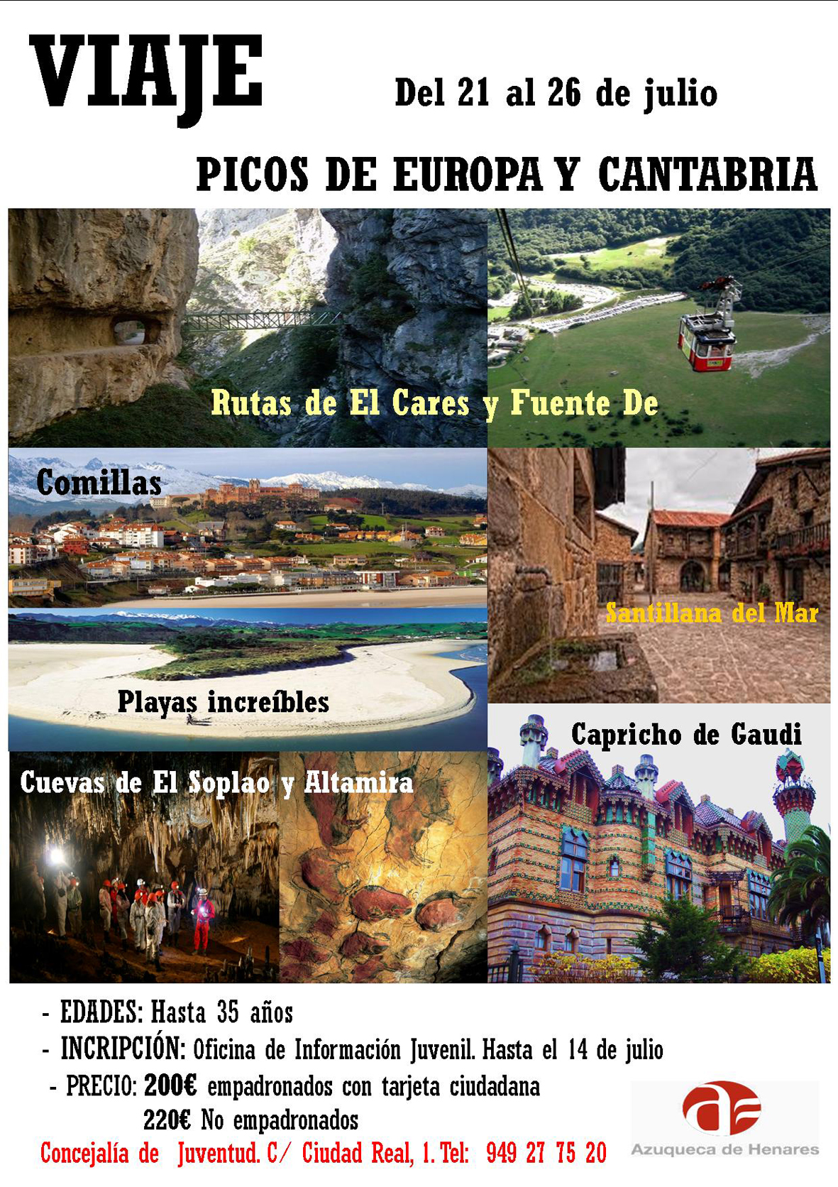 Coincidiendo con el final del curso académico y con el período estival, el Ayuntamiento de Azuqueca de Henares organiza dos salidas en el mes de julio para jóvenes de 12 a 35 años. Por un lado, el viernes 10, se oferta una excursión al Parque de Atracciones de Madrid. El precio es de 25 euros y se incluye el traslado en autobús (salida a las 11 horas y regreso a las 22 horas), la entrada y monitores acompañantes. La inscripción está abierta hasta el 3 de julio.Por otra parte, entre los días 21 y 26, se organiza un viaje a los Picos de Europa y Cantabria. El precio es de 200 euros, para empadronados titulares de la Tarjeta Ciudadana, y de 220 euros, para no empadronados. Esta cuota incluye ida y vuelta en autobús, cinco noches de alojamiento en albergue con pensión completa y entradas para realizar visitas guiadas al yacimiento de Atapuerca, al museo de la Evolución Humana, al teleférico de Fuente Dé, las Cuevas del Soplao y de Altamira, al Capricho de Gaudí y al palacio de la Magdalena. La inscripción se cierra el 14 de julio.Las personas interesadas pueden informarse en la OMIJ, en la planta baja de El Foro, en el teléfono 949 277 520 o en los correos electrónicos