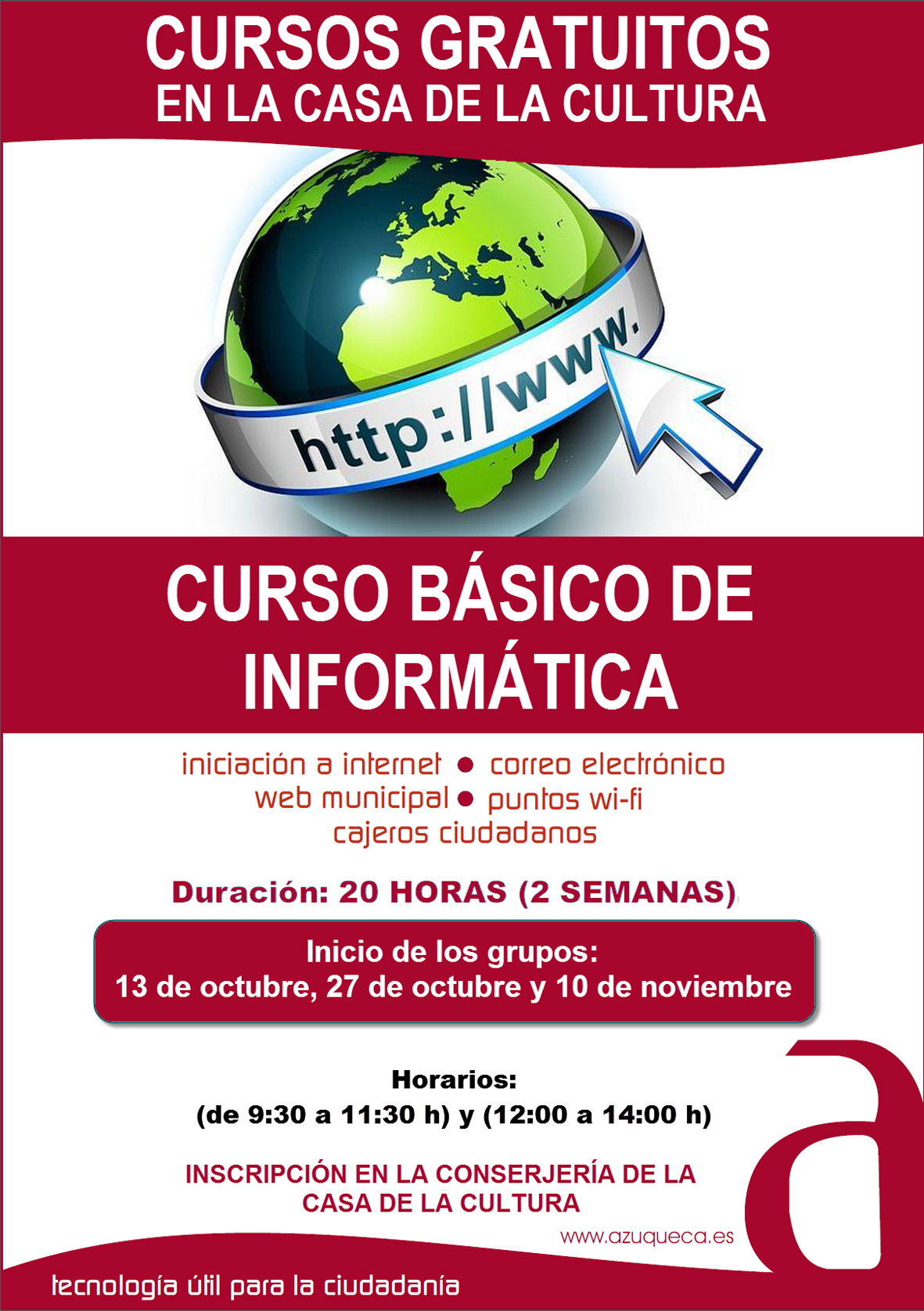 Hasta el día 9 de octubre, se pueden formalizar las inscripciones en los cursos básicos de informática que organiza el Ayuntamiento de Azuqueca y que se van a desarrollar entre los meses de octubre y noviembre. Los interesados pueden dirigirse a la conserjería de la Casa de la Cultura para formalizar su solicitud."Como en ediciones anteriores -explica el concejal de Nuevas Tecnologías, José Luis Escudero-, estos cursos están planteados para personas que quieran iniciarse en el manejo del ordenador, quieran empezar a navegar por internet y utilizar los servicios y las posibilidades que ofrece la red, entre ellos los recursos electrónicos del Ayuntamiento de Azuqueca". Se han programado seis grupos, con 15 plazas en cada uno de ellos. Los dos primeros cursos comenzarán el 13 de octubre (de 9:30 a 11:30 y de 12 a 14 horas); los siguientes se desarrollarán entre el 27 de octubre y el 7 de noviembre y los dos últimos del 10 al 21 de noviembre. Los interesados deben solicitar los grupos por orden de preferencia y, en caso de que el número de solicitudes sea superior al de plazas disponibles, habrá un sorteo el día 10 de octubre. Escudero ha destacado que "se amplía el número de cursos con respecto al año pasado, con dos grupos más para poder llegar a más gente". En total, se beneficiarán de esta iniciativa 90 ciudadanos. "La formación de los ciudadanos para evitar la denominada 'brecha digital' es una de las premisas que nos fijamos en el Ayuntamiento en el marco de la implantación de la denominada administración electrónica".MujeresEl Centro de la Mujer de Azuqueca ofrece además cursos de iniciación a la informática durante todo el año. Las interesadas en participar pueden dirigirse al propio centro para formalizar su solicitud, ubicado en el número 4 de la calle Peña de Francia, llamar al teléfono 949 27 73 46 o escribir al correo electrónico