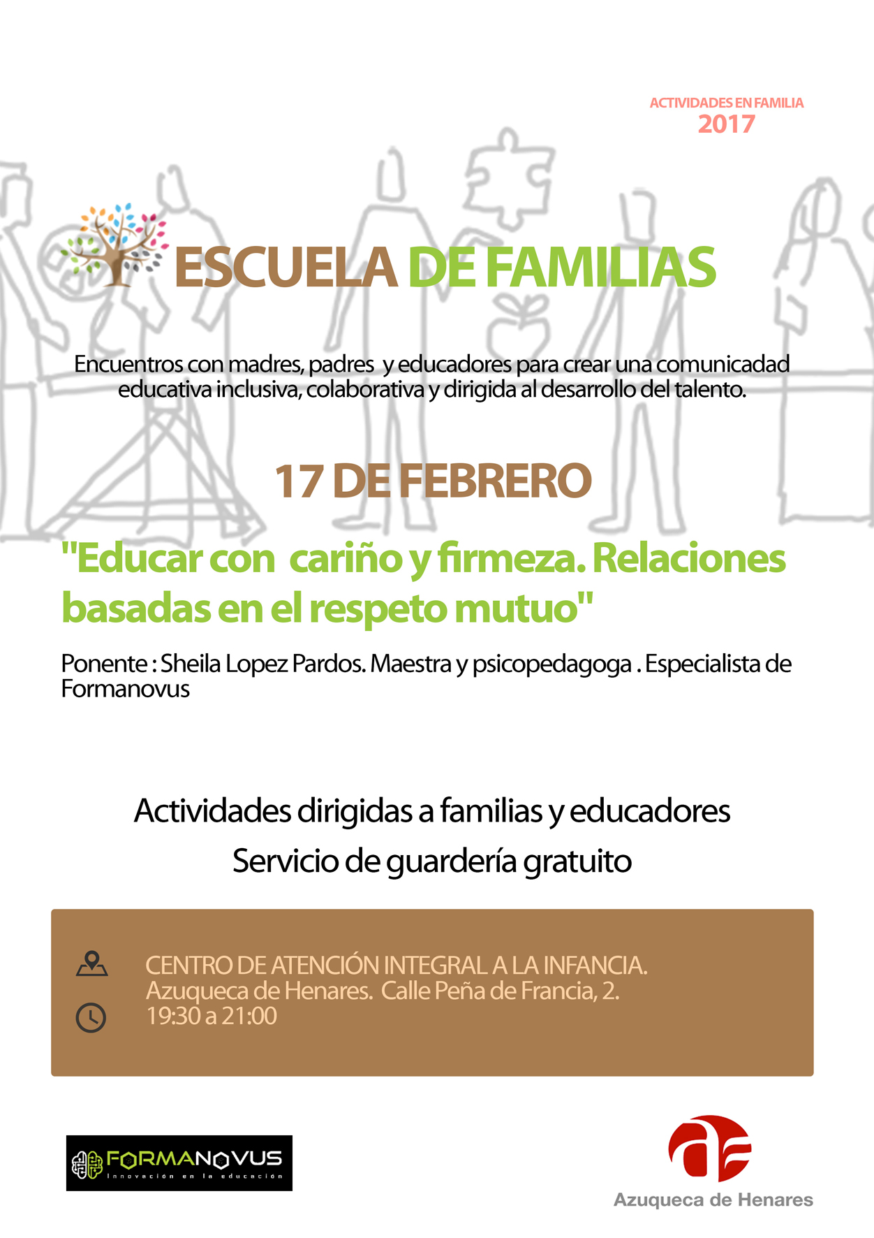 El programa municipal 'Escuela de Familias' ha programado para el próximo 17 de febrero un encuentro en el que se abordará la educación de los hijos. La sesión se desarrollará de 19:30 a 21 horas, en el Centro de Atención Integral a la Infancia de Azuqueca (CAII). En ella, Sheila López Pardos, maestra, psicopedagoga y especialista de la empresa Formanovus, impartirá una sesión titulada 'Educar con cariño y firmeza. Relaciones basadas en el respeto mutuo'. La concejala de Educación, Elisa Cansado, ha explicado que, con actividades como ésta, en el programa municipal Escuela de Familias se proponen "encuentros con madres, padres y educadores para crear una comunidad educativa inclusiva, colaborativa y dirigida al desarrollo del talento".La participación es gratuita, pero se recomienda inscribirse previamente para una mejor organización, a través del teléfono 608 015 496. Para facilitar la asistencia, se ofrece servicio gratuito de guardería.El CAII está situado en el número 2 de la calle Peña de Francia de Azuqueca de Henares.