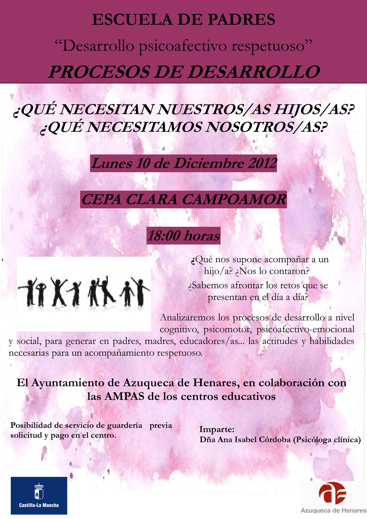 'Desarrollo piscoafectivo respetuoso' es el título de la charla que va a impartir la psicóloga Ana Isabel Córdoba el lunes 10 de diciembre, en el marco del programa Escuela de Padres que organiza el Ayuntamiento de Azuqueca, en colaboración con las Asociaciones de Madres y Padres de Alumnos de la localidad. La actividad se desarrollará en el Centro de Adultos 'Clara Campoamor', desde las 18 horas y la entrada es libre.Elisa Cansado, la concejala de Educación, ha recordado que el obejtivo de Escuela de Padres es "ayudar a las familias en la difícil labor de educar a los hijos". "Este programa es un espacio de intercambio, en el que distintos profesionales ofrecen pautas y herramientas a las familias para hacer frente a diferentes situaciones en el día a día", añade la edil, que recuerda que este curso han sido ya dos las charlas que se han desarrollado: una centrada en la prevención del consumo de alcohol y otra sobre los consejos escolares.
