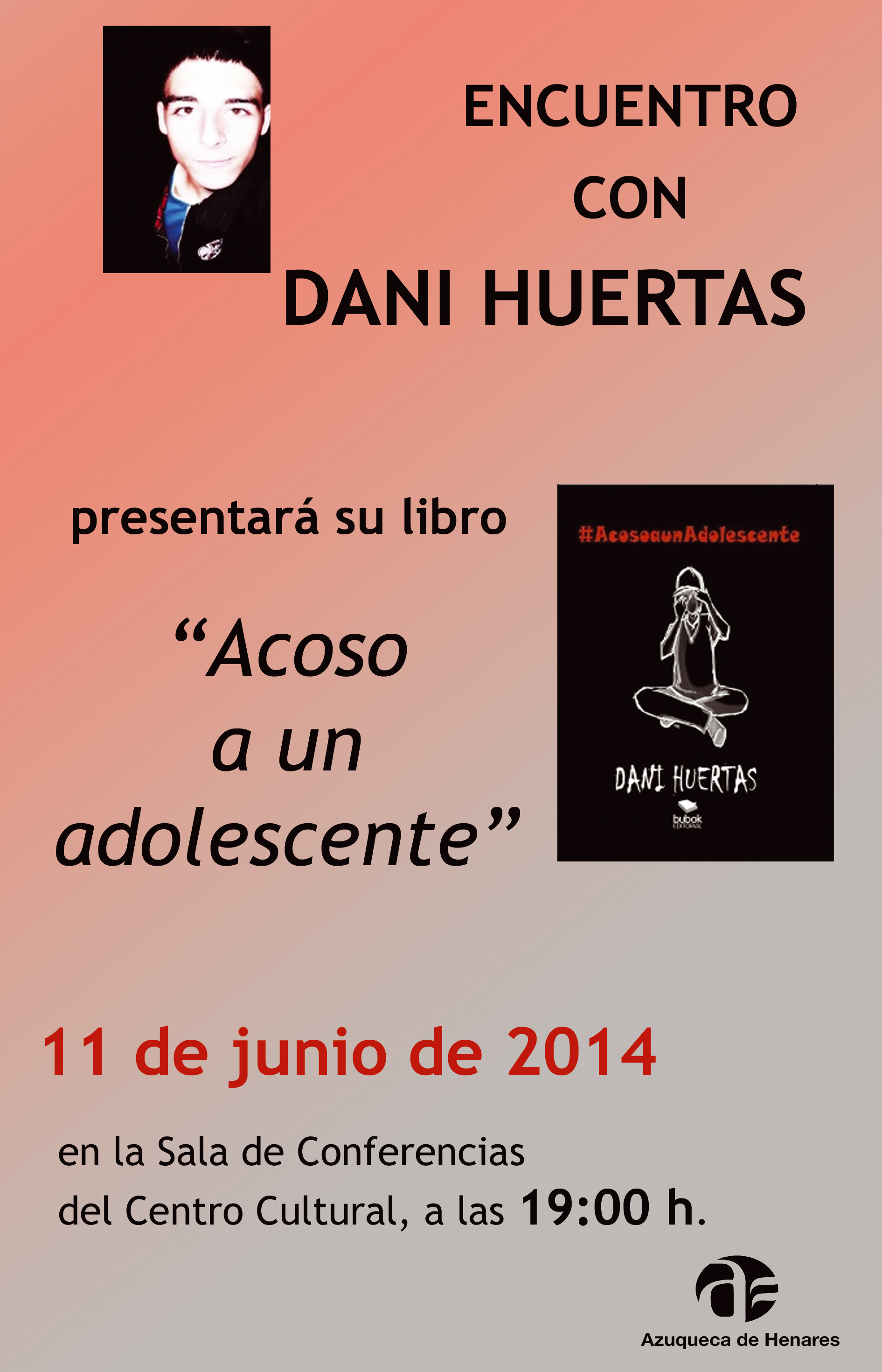 La Biblioteca Municipal Almudena Grandes celebra este miércoles un nuevo encuentro con autor que protagonizará Dani Huertas, vecino de Azuqueca de Henares y alumno de primero de Bachillerato del instituto Profesor Domínguez Ortiz. Huertas presentará su primera novela, #AcosoaunAdolescente, a partir de las 19 horas en la sala de conferenciasde la Casa de la Cultura."Este programa de encuentros literarios permite que escritores y lectores tengan la oportunidad de intercambiar opiniones y experiencias, al tiempo que sirve de plataforma para dar a conocer a nuevos autores, como ocurre en esta ocasión", destaca la concejala de Cultura, Sandra Yagüe, quien anima a los vecinos y vecinas a acudir a la sesión.Talleres municipalesPor otra parte, esta semana continúan las exhibiciones de fin de curso de los talleres anuales de la Casa de la Cultura. En concreto, desde el jueves 12 y hasta el martes 17 de junio, el alumnado de uno de los grupos de Pintura a cargo de Cruz Ciudad exhibe las obras realizadas durante el curso. La inauguración será a las 18:30 horas del jueves 12. Además, el viernes 13 y el sábado 14, a las 20 horas, el salón de actos acoge el festival de las clases de Danza que imparte Ana Sánchez.De cara al próximo curso, el periodo para la renovación de matrícula (antiguo alumnado) y la solicitud de plaza (nuevo alumnado) se mantiene abierto hasta el 20 de junio. Más información, pinchando aquí.Además, el Ayuntamiento de Azuqueca de Henares oferta talleres para los meses de verano. En este caso, la preinscripción se puede formalizar hasta el 24 de junio. Más información, pinchando aquí.