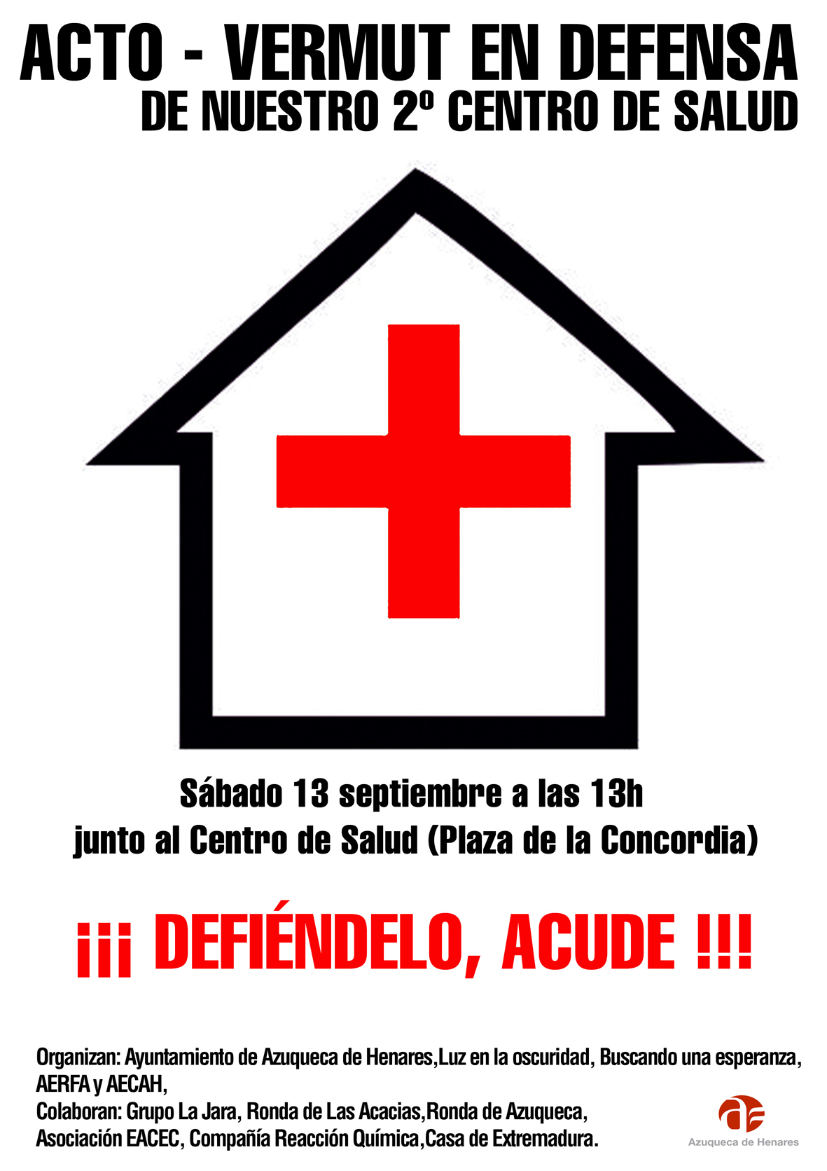 Bajo el lema '¡Defiéndelo, acude!', el Ayuntamiento de Azuqueca de Henares y las asociaciones sanitarias del municipio (Luz en la oscuridad, Buscando una esperanza, AERFA y AECAH) han convocado este sábado, 13 de septiembre, a partir de las 13 horas, una jornada en defensa del segundo Centro de Salud en la plaza de La Concordia. "Azuqueca no va a permanecer impasible ante este atropello", afirma el alcalde, Pablo Bellido, quien anima a los vecinos y vecinas a sumarse a este acto."Cospedal, después de paralizar las obras de remodelación del antiguo edificio durante tres años, ha rematado la faena traspasando el edificio al gobierno Central, que carece de competencias para hacer equipamientos sanitarios", explica el primer edil, quien recuerda que ese primer ambulatorio funcionó entre 1984 y 2007 y "se levantó sobre un terreno que el Ayuntamiento, es decir, los vecinos y vecinas de Azuqueca, compraron y donaron para que se construyera un Centro de Salud". "Ese esfuerzo no va a caer en saco roto y vamos a emprender todo tipo de acciones para oponernos a esa cesión y conseguir que Azuqueca cuente con un segundo centro sanitario", sostiene."No pedimos un trato preferente puesto que Azuqueca es el único municipio con más de 20.000 habitantes de toda Castilla-La Mancha que carece de un segundo Centro de Salud ", apunta la concejala de Protección de la Salud, Elisa Cansado. "Tampoco es un capricho, sino un recurso necesario para la Zona Básica de Salud de Azuqueca, que atiende también a la población de Alovera, Villanueva de la Torre y Quer, es decir, a casi 55.000 personas".En cuanto a la jornada reivindicativa, se ofrecerá un vermú y contará con la actuaciones musicales del grupo La Jara y las rondas Las Acacias y de Azuqueca, además de un espectáculo de calle a cargo de la compañía Reacción Química. La edil agradece a todos ellos su participación, al igual a la asociación EAEC y a la Casa de Extremadura.Audios relacionadosEntrevista a José Luis Escudero, portavoz del Equipo de Gobierno, sobre la jornada reivindicativa del sábado 13 de septiembre.