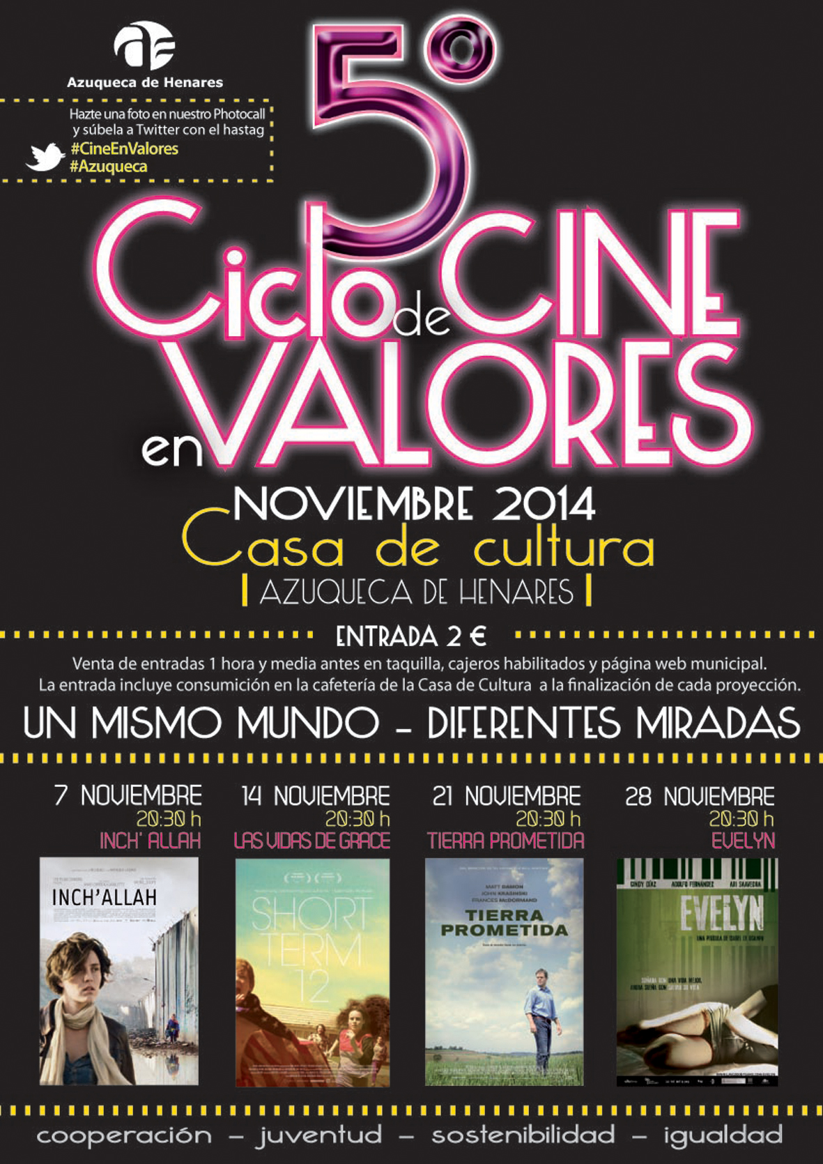 Todas las películas se proyectan a las 20:30 horas, en el Salón de Actos de la Casa de la Cultura y las entradas, al precio de 2 euros, se podrán adquirir en los cajeros ciudadanos, en la página web www.azuqueca.es y una hora y media antes de cada sesión en la taquilla (la entrada da derecho a una consumición en la cafetería de la Casa de la Cultura tras cada proyección). Además, este año habrá un espacio (photocall) para que los ciudadanos se hagan fotos y se ha generado la etiqueta #CineEnValores #Azuqueca para Twitter. Programa:-7 de noviembre: ‘Inch’ Allah’, de Anaïs Barbeau-Lavalette (Cooperación).