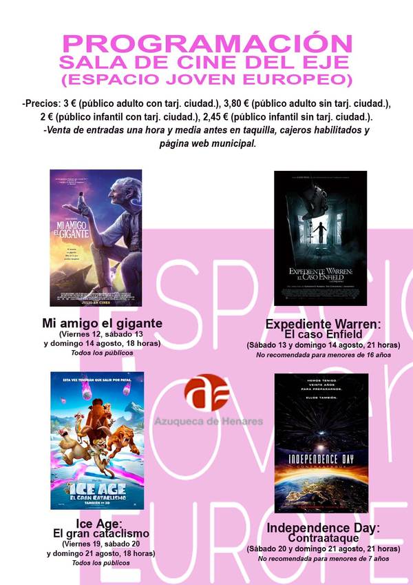 ‘A Cambio de Nada’, una de las películas triunfadoras en la última edición de los Premios Goya de cine, llega este fin de semana a Azuqueca de Henares, dentro de la programación del Cine de Verano. La ópera prima de Daniel Guzmán se proyectará en el patio del antiguo cuartel de la Guardia Civil, el próximo viernes, día 19 de agosto a las 22 horas. La entrada tiene un coste de dos euros y ya se pueden adquirir en los cajeros ciudadanos.Por otro lado, en EJE, este fin de semana se ofrecen dos ofertas cinematográficas de temática muy diferente. El viernes, sábado y domingo a las 18 horas se proyectará ‘Ice Age. El Gran Cataclismo’, una película de animación para todos los públicos.La otra opción que ofrece el EJE es ‘Independence Day: Contraataque’, acción y ciencia ficción en la última secuela de la saga. En este caso, las proyecciones tendrán lugar el sábado 20 y el domingo 21 a las 21 horas. Esta película no está recomendada para menores de siete años. Las entradas para las dos películas que se exhibirán en el EJE tienen un coste de 3 € (público adulto con tarjeta ciudadana), 3.80 (público adulto sin tarjeta ciudadana), 2 € (público infantil con tarjeta ciudadana) y 2.45 € (público infantil sin tarjeta ciudadana). Se pueden adquirir en la web municipal, en los cajeros ciudadanos y en taquilla una hora y media antes del pase.Teatro familiar