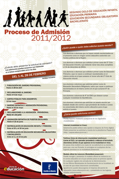 Desde el 1 al el 28 de febrero, está abierto el abierto el plazo de presentación de solicitudes para la admisión de alumnos del segundo ciclo de Educación Infantil, Primaria, Secundaria Obligatoria y Bachillerato en centros educativos públicos y privados concertados para el curso 2011/2012. Para la presentación de solicitudes, la Junta de Comunidades ha habilitado tres modalidades: presencial, telefónica y en línea. En el primer caso, los interesados deben recoger y presentar el modelo oficial de la instancia en el centro educativo donde se solicita plaza en primera opción, en cualquier registro de entrada de la Administración o en las Oficinas Municipales de Escolarización.