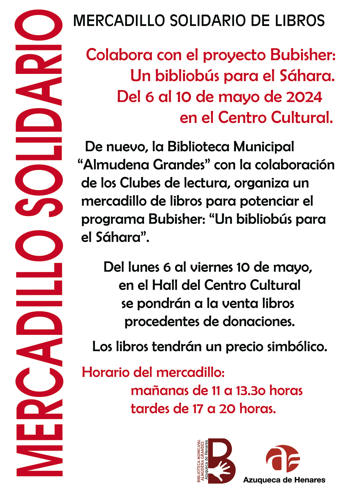 Desde este lunes día 6 y hasta el viernes 10 de mayo, la entrada de la Casa de la Cultura de Azuqueca de Henares acoge una nueva edición del mercadillo de libros que organizan la Biblioteca Municipal Almudena Grandes y los Clubes de Lectura en apoyo del programa “Bubisher: Un bibliobús para el Sáhara”. El alcalde azudense, Miguel Óscar Aparicio, ha visitado el mercadillo, junto con la concejala de Educación y Cultura, Susana Santiago, y el delegado provincial de Educación, Cultura y Deportes, Luis Ángel Fernández-Montes.