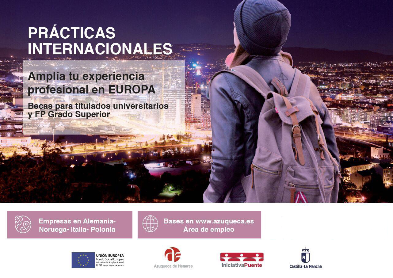 Durante toda esta semana, hasta el viernes (incluido), se pueden solicitar las prácticas internacionales del programa Iniciativa Puente impulsado por el Ayuntamiento de Azuqueca de Henares, con la colaboración de la Junta de Comunidades de Castilla-La Mancha y con financiación del Fondo Social Europeo. La convocatoria se dirige a jóvenes con edades comprendidas entre los 18 y los 29 años, inscritos en el sistema nacional de Garantía Juvenil, y que tengan un título universitario o de Formación Profesional de Grado Superior.Se ofrecen 15 plazas en centros de trabajo en Alemania, Francia, Noruega, Italia y Polonia, pertenecientes a siete empresas que tienen sede en Azuqueca: Bormioli, Chemo, Exide, Hydro, Isover, Mercedes y Verallia. Las ayudas incluyen los gastos de desplazamiento, el alojamiento y manutención y también la preparación pedagógica y cultural de los beneficiarios, un curso de formación lingüística en inglés, la gestión de las prácticas, una tutorización de su actividad, la gestión de los certificados de idiomas y aprovechamiento de prácticas y los seguros correspondientes. Las solicitudes, acompañadas del resto de documentación requerida, se deben presentar en el Servicio de Atención a la Ciudadanía (SAC) del Ayuntamiento. Más información, AQUÍ.
