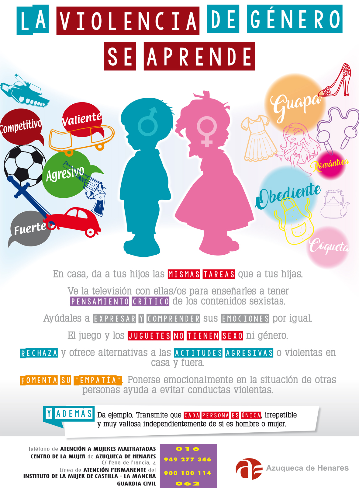Durante el acto organizado por el Ayuntamiento de Azuqueca con motivo del Día Internacional contra la Violencia de Género que se ha desarrollado en el EJE, el alcalde, José Luis Blanco, ha reclamado la eliminación de este tipo de comportamientos, y ha recordado que este año más de 40 mujeres han sido asesinadas en España y más de 20 menores han quedado huérfanos. "Tenemos que tomar partido. La posición neutral ayuda siempre al opresor, nunca a la víctima", ha aseverado Blanco.El primer edil ha leído un manifiesto (pinche AQUÍ) en el que se recuerda que "la violencia contra las mujeres en todas sus formas es una violación de los derechos humanos". "La sociedad no puede justificar ni proteger a los hombres que agreden, insultan, humillan, acosan y asesinan", se afirma en el texto que ha leído el alcalde y en el que se recuerda que el Ayuntamiento de Azuqueca de Henares ha sido pionero en España con la implantación de un programa de ayuda y atención psicológica dirigido a menores víctimas de violencia de género, al tiempo que se mantiene "el compromiso de no escatimar esfuerzos ni medios" para ayudar a las mujeres.En el manifiesto se agradece el trabajo de las instituciones implicadas en la atención y prevención de la violencia de género y se hace un llamamiento expreso a los jóvenes. "En vosotros y en vosotras tenemos depositada la esperanza de que algún día podamos celebrar que no ha habido más muertes, más acosos, más coacciones, en definitiva, más violencia hacia vuestras compañeras, amigas, hermanas", ha señalado el alcalde.'La violencia de género se aprende'Tras la lectura del manifiesto, una técnica del Centro de la Mujer de Azuqueca ha presentado la campaña municipal 'La violencia de género se aprende' con la que se pretende extender la prevención a las edades más tempranas. El Ayuntamiento de Azuqueca desarrolla desde hace años el programa Kaleidoscopio dirigido a la adolescencia, y con esta campaña se pretende iniciar antes la concienciación en las familias y en el conjunto de la sociedad. A través de dípticos, que se distribuirán en el municipio, se difunden consejos relacionados con la educación, los roles, los juegos y juguetes, los estereotipos y la violencia. "La violencia de género es un problema social muy grave y una forma eficaz de prevenirla es educar en igualdad desde que nacemos", se afirma en el díptico.Durante el acto, se han entregado los premios de la tercera edición del concurso de Cortometrajes contra la violencia de género convocado por el Ayuntamiento, dirigido al alumnado de 4º curso de la ESO de los institutos de la localidad. Se han presentado seis trabajos en los que han participado alrededor de 60 chicas y chicos. El primer premio ha sido para alumnos del San Isidro por el cortometraje 'El bucle'. El segundo premio ha sido para 'Alethephobia', presentado desde el Arcipreste de Hita. Los ganadores del primer premio disfrutarán de una cena en la cafetería del Centro de Ocio, pases para la bolera del EJE y para la utilización de las pistas municipales de pádel, tenis y atletismo; mientras los clasificados en segundo lugar reciben una cena en el mismo establecimiento y entradas para la bolera municipal.